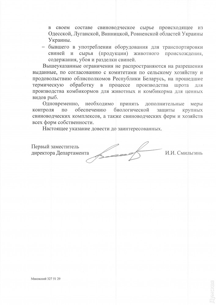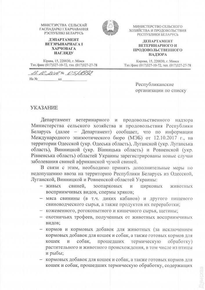 Республика Беларусь запретила ввоз свиней и свинины из Одесской, Луганской, Винницкой и Ровненской областей Украины. Связано это с новыми вспышками африканской чумы свиней, говорится в указании департамента ветеринарного и продовольственного надзора министерства сельского хозяйства РБ. Из перечисленных регионов Украины в Беларусь запрещено ввозить живых свиней, свинину (в том числе мясо диких кабанов), другую пищевую и непищевую продукцию свиноводческой отрасли, включая кожевенное сырье. СМЕРТЬ РОСІЙСЬКИМ ОКУПАНТАМ! Помітили помилку? Виділяйте слова з помилкою та натискайте control-enter |