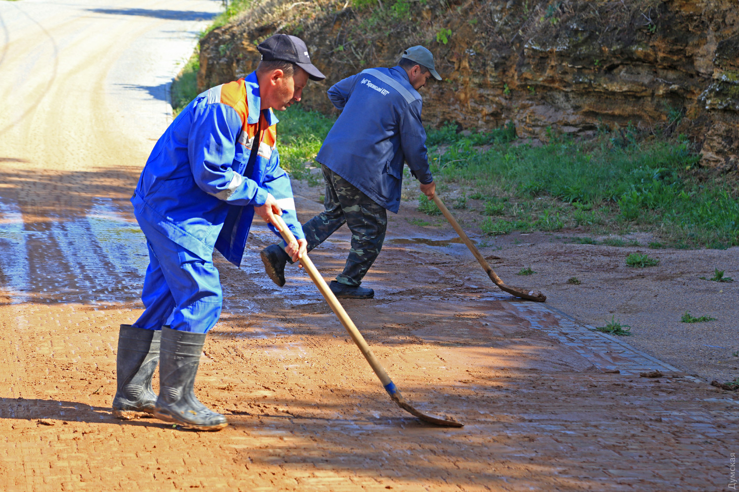 Некоторые заведения отгородились от бурлящего потока мешками с песком, благодаря чему спасли свои интерьеры. Сильно пострадало только одно кафе. Поток ушел в море через пляж, забрав с собой кубометры песка. Сброс происходил в трех местах. В результате море у берега окрасилось в черно-коричневый цвет. Лишь в нескольких сотнях метров от берега оно осталось зелено-синим. На склонах повыше пляжа образовалось несколько водопадов, и на автодорогу, которая соединяет улицу Каманина с «Морской симфонией», пролилась красная глинистая жижа. Сейчас строители убирают ее лопатами. Фото — Сергей Смоленцев