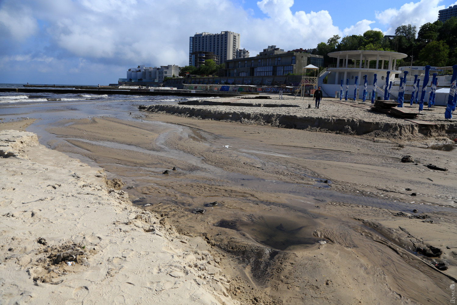 Сильный дождь, ливший ночью и в первой половине дня в Одессе, не только затопил несколько улиц и вызвал падение деревьев, но и прорвал канализацию в Аркадии, из-за чего в море смыло тонны песка. Работники аркадиевских магазинов рассказали нам, что уровень канализационных стоков, которые затопили центральную аллею, составил 15-20 см. Впоследствии бригады уборщиков убрали следы фекалий, но запах остался, и без маски здесь пока гулять не рекомендуется.