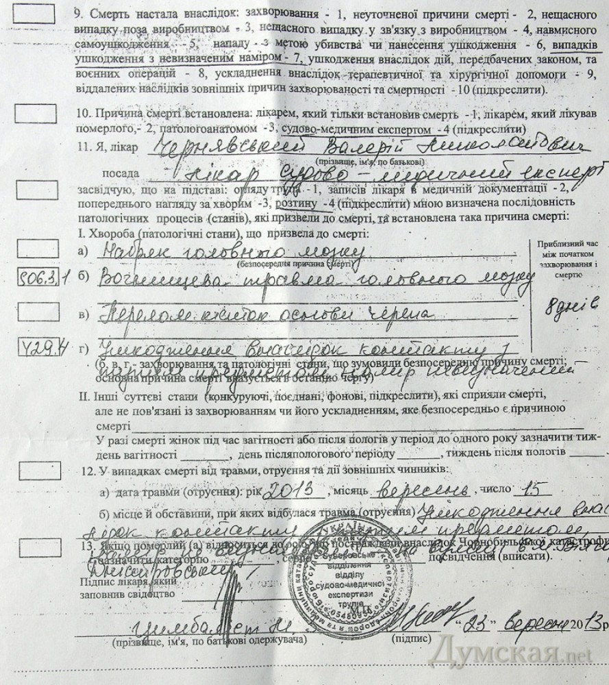 «Свобода» и смерть. В Аккермане произошло убийство с политическими последствиями (фото, документы)Трагическая гибель молодого жителя Белгорода-Днестровского, моряка по профессии Сергея Цимбалиста, который скончался 23 сентября в больнице от побоев, нанесенных неизвестными, может получить всеукраинский резонанс. А все из-за политики. Во-первых, роковой удар мужчине нанесли возле скандально известного аккерманского ночного клуба «Клумба», принадлежащего лидеру местной горорганизации «Свободы» Игорю Усову («Думская» уже писала о нем), а во-вторых, среди участников драки были активисты этой политсилы, причем один из них конфликтовал с Цимбалистом. Наши корреспонденты побывали в древнем городе на берегу Днестровского лимана, чтобы выяснить все подробности случившегося. «Перелом костей основания черепа, очаговая травма головного мозга, повреждение в результате контакта с тупым предметом, отек головного мозга » — так бесстрастный медицинский документ описывает результаты того несчастливого вечера в Белгороде-Днестровском. Бланк содержит всего четыре строчки для перечня повреждений на теле 27-летнего моряка — наверное, поэтому в заключении не фигурируют выбитые зубы и сломанные ребра. Очевидцы говорят: самая обычная драка у дверей ночного клуба. Никаких идеологических или коммерческих мотивов, только личное. Но даже если политика действительно не была замешана, политические последствия у смерти Цимбалиста обязательно будут. Во всяком случае, заинтересованные в таком развитии событий есть. Но обратимся к фактам. Драка произошла в ночь с 14 на 15 сентября. В ней участвовало несколько десятков человек. Столько же, в том числе некий сотрудник милиции, просто смотрели на потасовку. По словам свидетелей, все началось с конфликта между Сергеем Цимбалистом и Алексеем Корниенко, активистом «Свободы» и родственником Игоря Усова. Молодые люди вроде бы не поделили даму сердца. В тот вечер оба отдыхали в «Клумбе» и после словесной перепалки в помещении вышли из клуба «продолжить разговор». К ним присоединились друзья-товарищи, и началась массовая потасовка. Тогда досталось и другому посетителю клуба, который вступился за Сергея и попытался разнять дерущихся. На него набросились вшестером, повалили, били ногами. К счастью, он отделался только разбитым лицом. После этого Цимбалист решил ретироваться от греха подальше. Он уже отходил от клуба, когда неожиданно в полутьме получил мощнейший удар в челюсть, который, по всей видимости, и стал роковым. В больницу его доставили только утром: девушка, которая была с аккерманцем в клубе (та самая дама сердца, из-за которой повздорили мужчины), не осознала опасности и пыталась сама обработать раны. Ночью Сергей впал в кому. Принимая пациента, врачи городской больницы сразу сказали, что шансов у него нет: «Так и заявили нам - мол, он, скорее всего, умрет, надо лишь немного подождать. И ничего не делали», — говорят друзья погибшего. Во вторник 17-го друзья передали в Киев диск с результатами анализов и обследований, и столичные специалисты потребовали немедленно провести операцию. В среду пациента перевезли в Одессу, в областную больницу, но на операционный стол он так и не попал: медики побоялись, что сердце не выдержит наркоза. Не приходя в создание, Сергей Цимбалист умер 23 сентября 2013 года. Органы вну