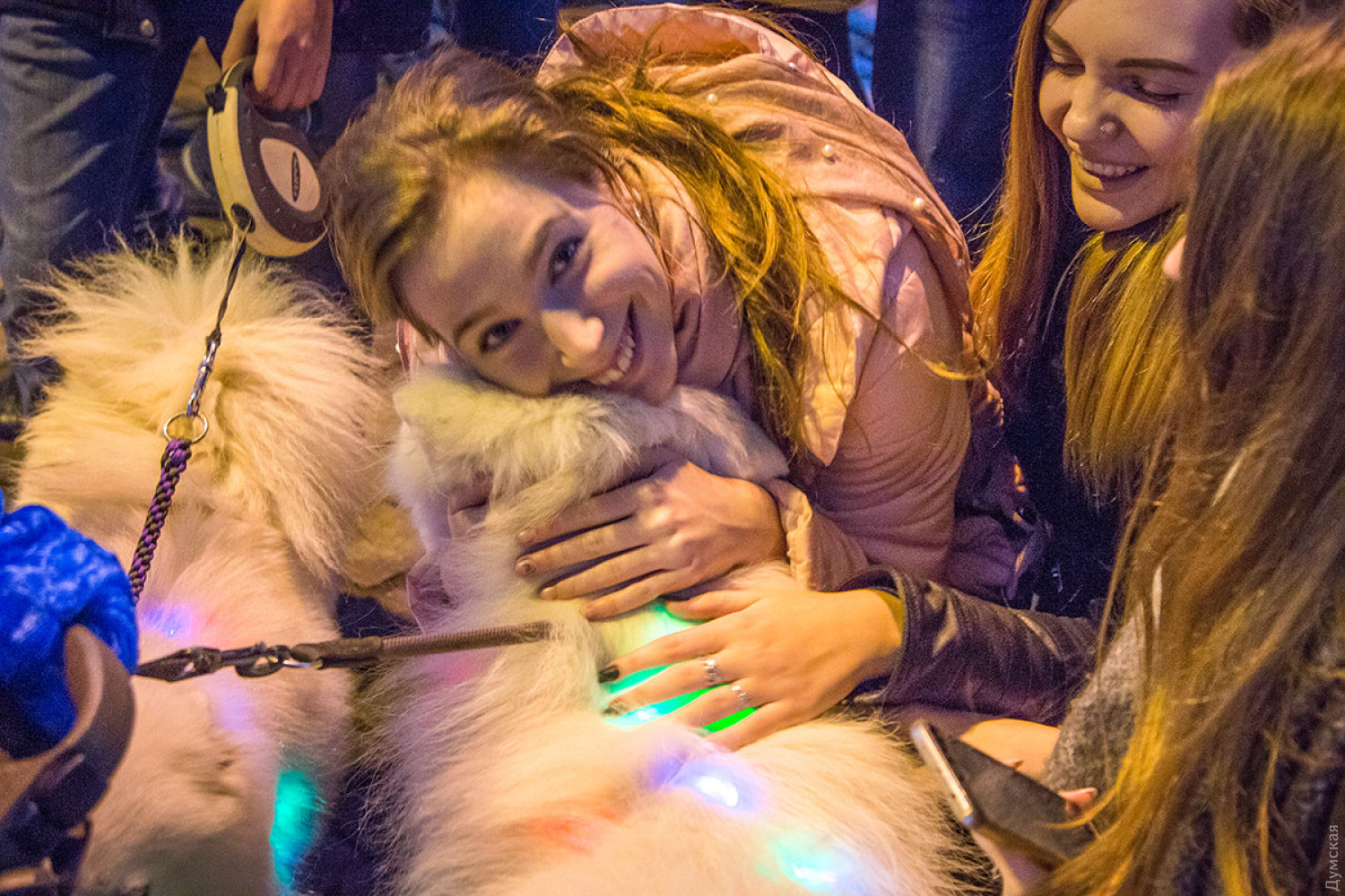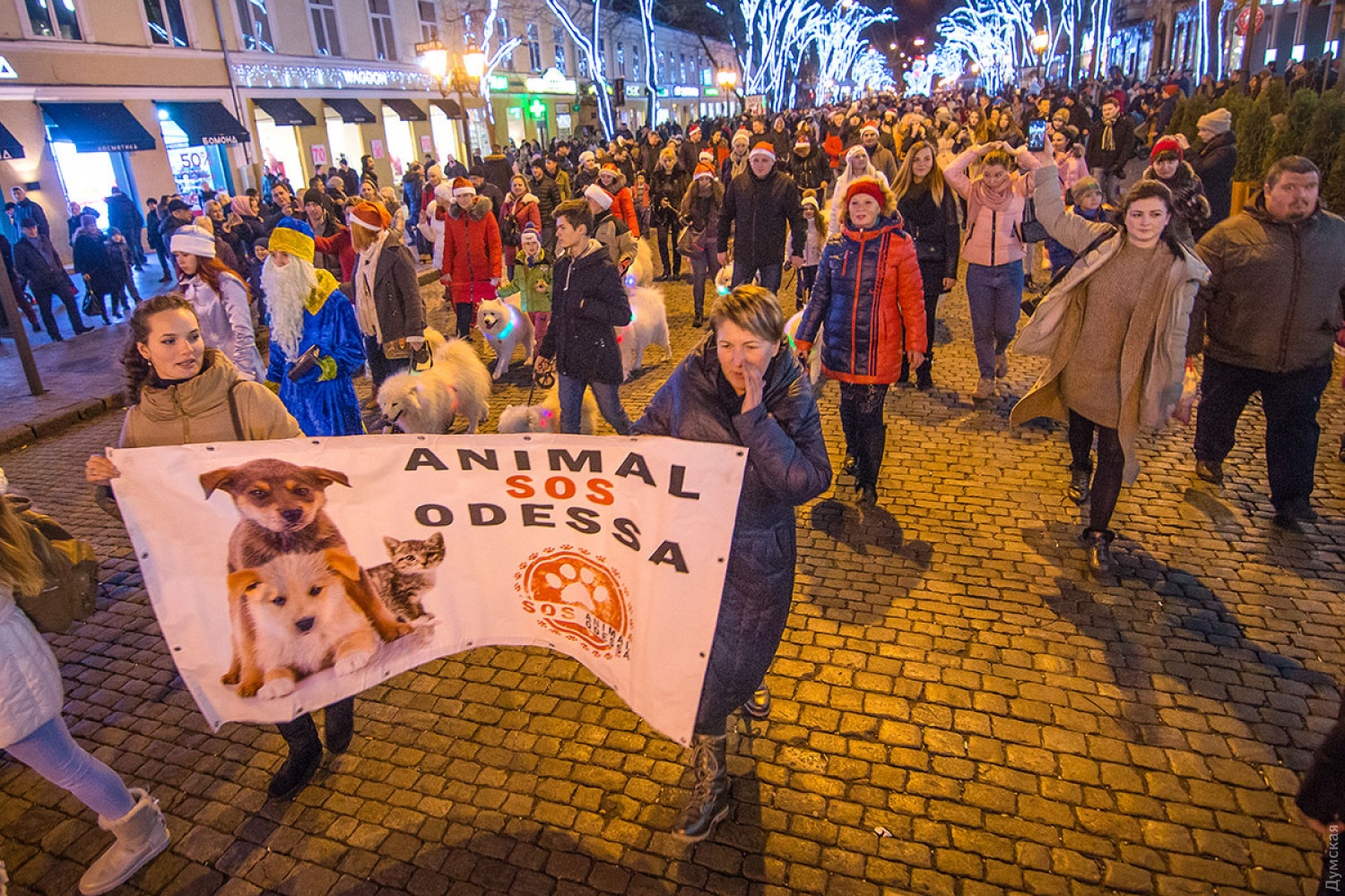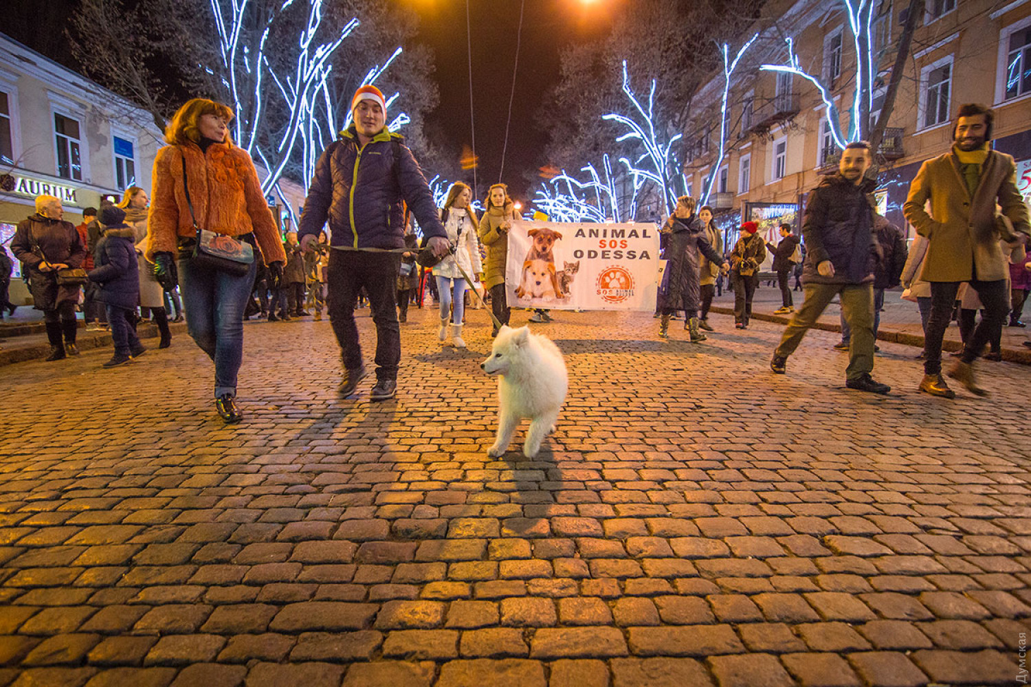 Прохожие очень эмоционально реагировали на парад — фотографировались, обнимали и гладили добродушных белых собак. Ольга, хозяйка годовалого самоеда Атиса, рассказала «Думской», что парад призван подарить радость тем, у кого еще нет такого домашнего животного. «Когда я увидела эту породу, никакой другой не хотелось. Он - белый, пушистый, любит детей. Как большой кот», — поделилась девушка. По словам собачницы, содержать самоедов несложно. Главное, ежедневно следить за их шерстью, купать и расчесывать. На главной улице Одессы двуногие участники марша развернули плакат организации Animal SOS и призвали прогуливающихся по Дерибасовской не забывать о помощи бездомным животным. Фото — Александр Гиманов