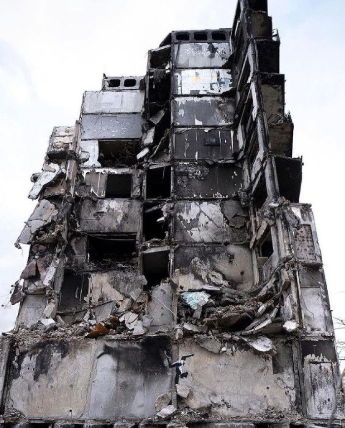 Жінку в протигазі, яка з'явилася на стіні пошкодженої будівлі у військовому містечку Гостомеля, наші захисники на зиму закриють плівкою.