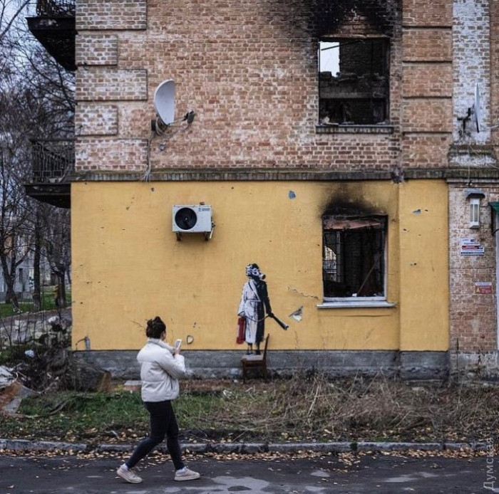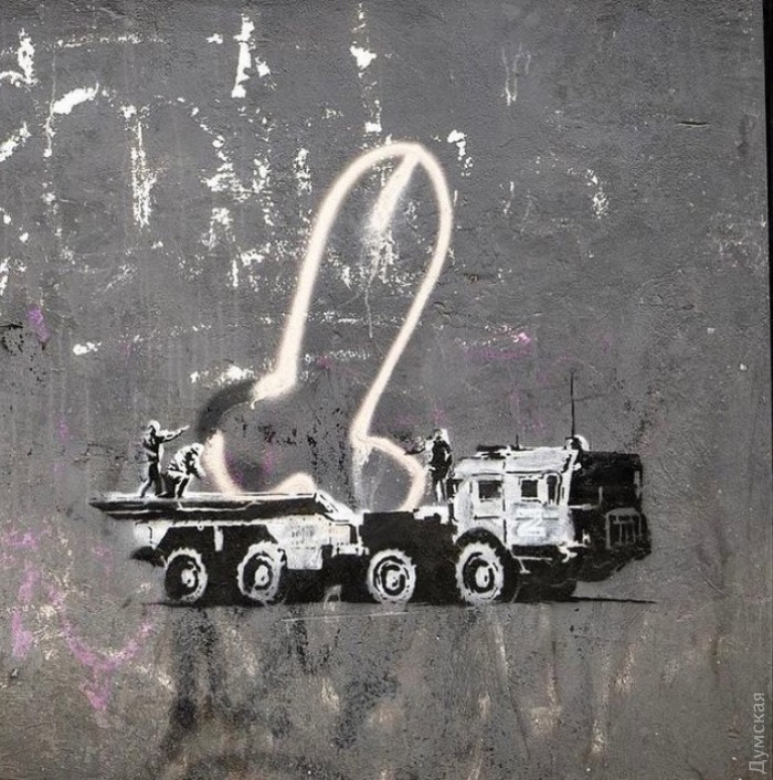 "…и нарисованный менее талантливыми предшественниками пенис, который Бэнкси превратил в ядерную боеголовку, загруженную в кузов бронированного грузовика, маркированного Z.« — ах, наш неповторимый одесский сарказм!
