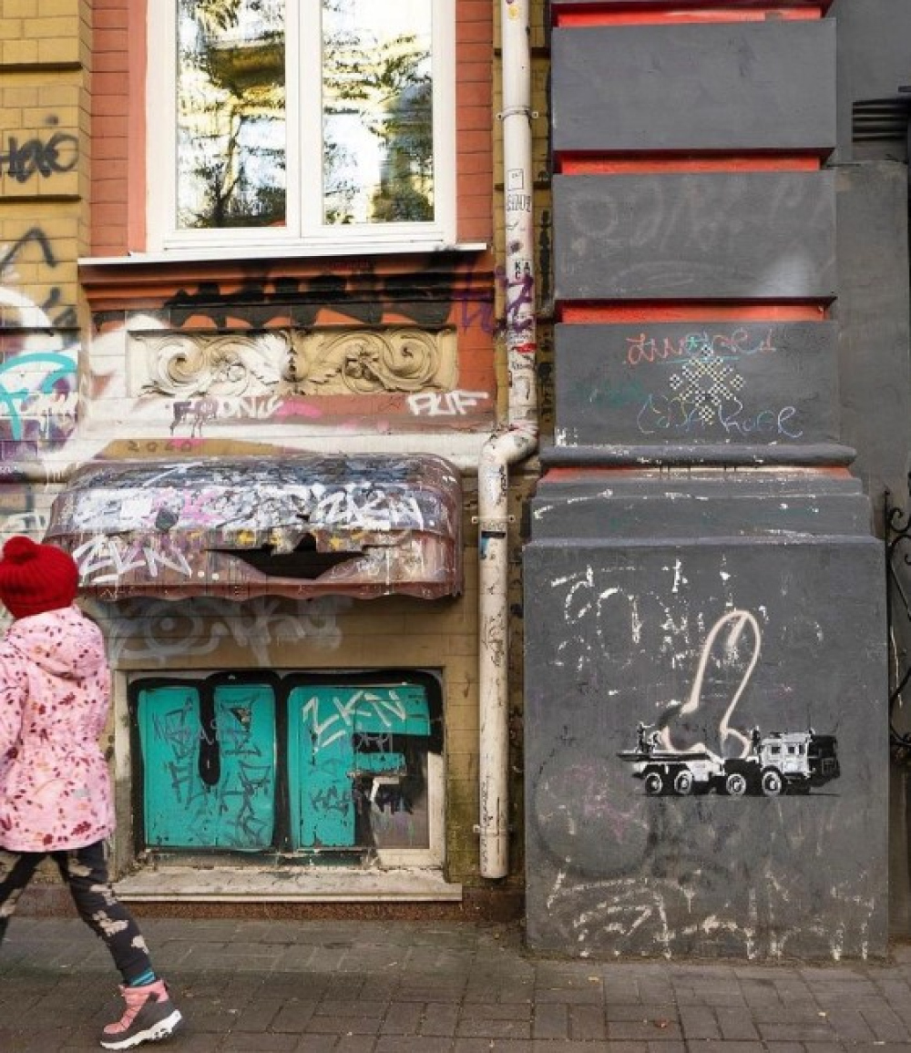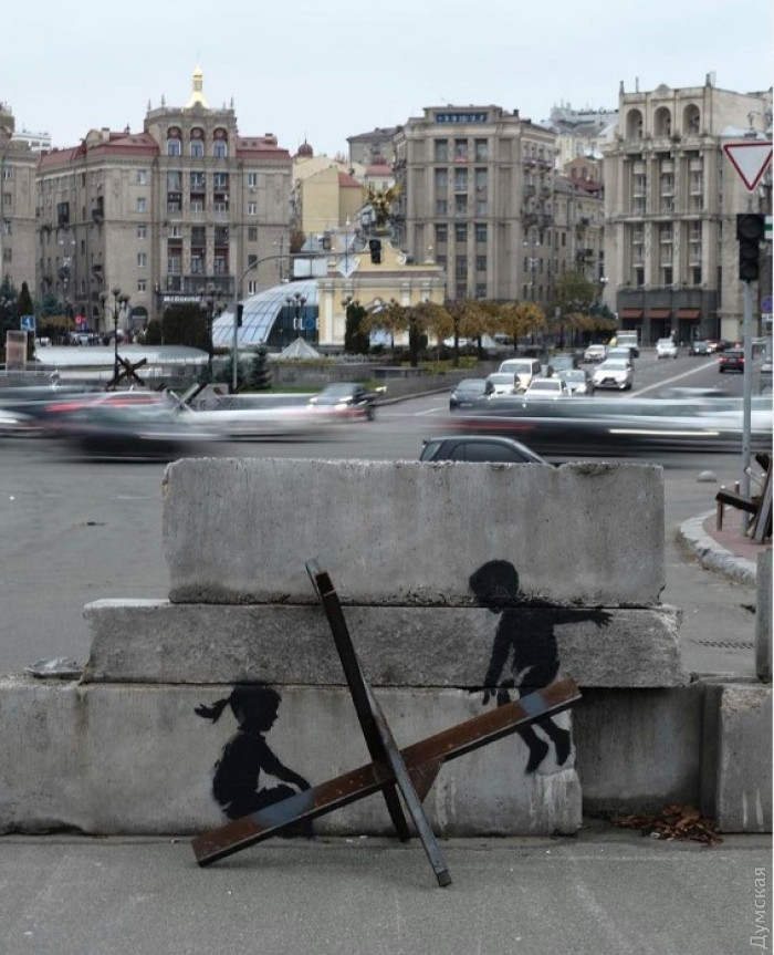 Зазначимо, що ще дві роботи художника з'явилися в Києві. Це діти, що «гойдаються» на протитанковому їжаку на Майдані Незалежності, і намальований менш талановитими попередниками пеніс, який Бенксі перетворив на ядерну боєголовку, завантажену в кузов броньованої вантажівки, маркованої Z.