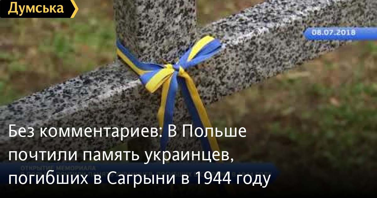 Без комментариев: В Польше почтили память украинцев, погибших в Сагрыни в 1944 годуСМЕРТЬ РОССИЙСКИМ ОККУПАНТАМ! Заметили ошибку? Выделяйте слова с ошибкой и нажимайте control-enter Думская ТВ. Сюжеты: