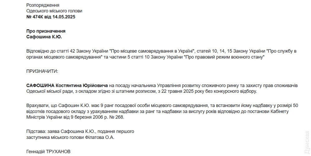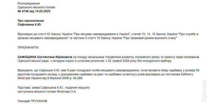 Без конкурсу і з 50% надбавкою: керувати одеською торгівлею буде ексспівробітник податкової та «Інфоксу»Начальником міського управління торгівлі призначили екс-директора центру з надання послуг «Інфоксводоканалу» Костянтина Сафошина. Розпорядження підписав мер Одеси, передає наш кореспондент. У документі зазначено, що посаду начальника управління розвитку споживчого ринку та захисту прав споживачів (така довга офіційна назва структури) Сафошин отримав без конкурсу. Також йому належить 50% надбавка до зарплати за рівень кваліфікації та вислугу років.