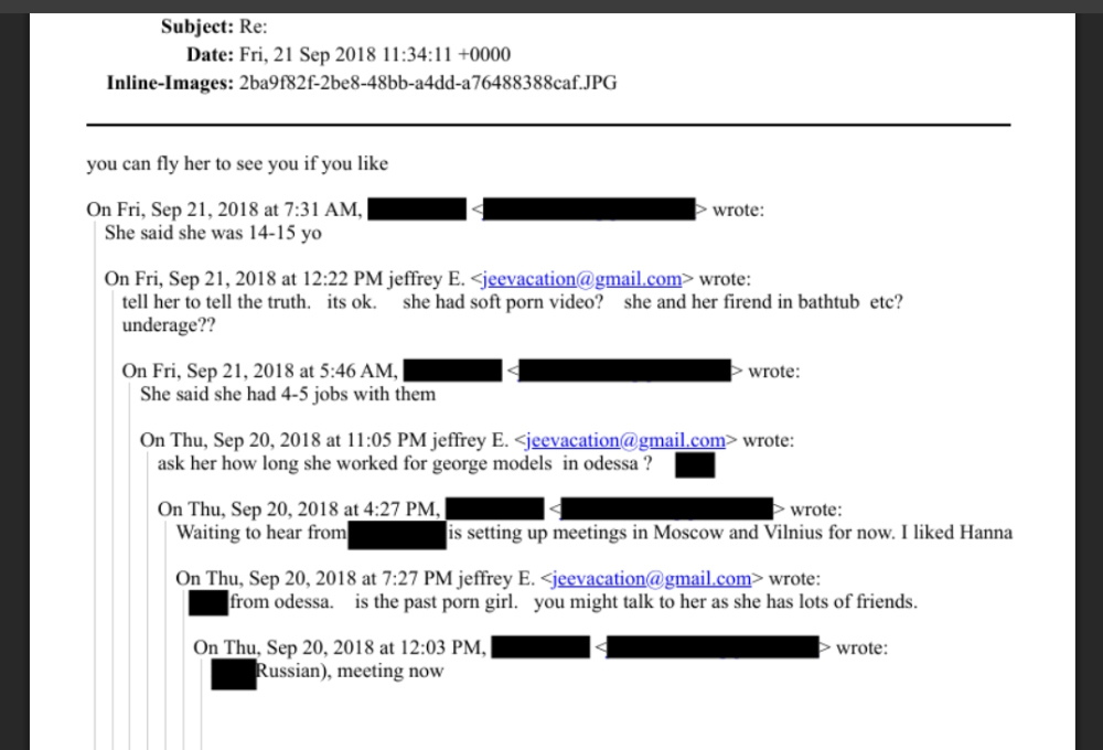 Всесвітня мережа з постачання жінок і неповнолітніх дівчат для впливових людей, створена американцем Джеффрі Епштейном, залучала для своїх завдань одеситок. Такий висновок можна зробити з опублікованих файлів фінансиста, де назва нашого міста згадується щонайменше 200 разів. Чи бував сам Епштейн в Одесі незрозуміло, але люди з його команди неодноразово приїжджали. Зокрема, якийсь Брок Пірс (Brock Pierce) — на початку вересня 2012 року. «Я буду в місті з 4 по 8 вересня. Зараз перебуваю в Москві. Наступна зупинка — Київ, а потім Одеса», — пише він Епштейну 29 серпня 2012 року. Оприлюднені файли дають лише приблизне уявлення про масштаби діяльності американця. Більшість з них - короткі повідомлення з телефонних месенджерів, які піддалися цензурі слідчих органів США. Ключові фрази або прізвища в них зафарбовані чорними квадратами. Західні ЗМІ стверджують, що фінансист не тільки постачав жінок тополігархам і лідерам країн, але знімав зустрічі на приховані камери, а компромат міг відправляти до кремля. Зараз важко сказати, скільки дівчат з нашого міста вирушило на заклик Епштейна на пошуки щастя, але в опублікованих файлах є прізвища одеситок, які літали до Парижа. Якась Ольга Засядко побувала у французькій столиці на початку жовтня 2018 року, щоб купити авіаквитки для неї Епштейн залучав спеціального російськомовного менеджера по роботі з клієнтами компанії «Центуріон» — Наталю Молоткову. 23 вересня 2018 року один із підлеглих Епштейна – Леслі Грофф (Lesley Groff) пише йому повідомлення: «Мені потрібні дані для бронювання авіаквитків з Одеси (Олі) на 2-4 жовтня. Будь ласка, повідомте, чи є певний час прибуття та від'їзду. Дякую!». Ймовірно, отримавши паспортні дані одеситки, Грофф наступного дня - 24 вересня, пише Наталії Молотковій. «Доброго дня, Наташа, або хтось із її команди. Мені потрібен квиток в аеропорт Парижа туди та назад для Ольги Засядко з Одеси, Україна, на 2 жовтня, прибуття в Париж ввечері, повернення в Одесу ввечері 4 жовтня». Іншими словами, дівчину хотіли доставити в місто всього на день. Судячи з подальшого листування, дівчина приїхала до французької столиці, зустріч у готелі пройшла благополучно, а клієнт отримав те, що хотів. На початку жовтня невідомий (його ім'я зафарбовано) написав: «19-річна дівчина з Одеси. Я попросив її прийти завтра, щоб зробити фотографії в бікіні». Швидше за все, Епштейн зв'язувався з дівчатами через одеське модельне агентство George models. В одному з файлів листування він просить свого кур'єра, який перебуває в місті: «Запитайте її, як довго вона працювала в George Models в Одесі?». Той відповідає: «Це колишня порноактриса. Вона сказала, що у неї було 4-5 робіт з ними. Можливо, ви зможете з нею поговорити, у неї багато друзів». Можна припустити, що подібні історії з переміщенням дівчат до Європи на кілька днів відбувалися неодноразово. Відомості про відвідування Одеси емісарами Епштейна можна знайти за 2010, 2012, 2018 і 2019 роки. Ще одна згадка про одеситок є за лютий 2018 року. Якась дама пише звіт про зустріч: «Мені сподобалася сусідка по кімнаті з Одеси. Єдина симпатична. Інша сусідка не симпатична! Ще одна сербка, я майже впевнена, була під наркотиками. Не найкраща компанія, думаю, в жіночому відділі немає красивих дівчат, принаймні, ті, кого я бачила сьогодні ввечері, були далекі від краси». Загалом, імперія з доставки українських дівчат для ін