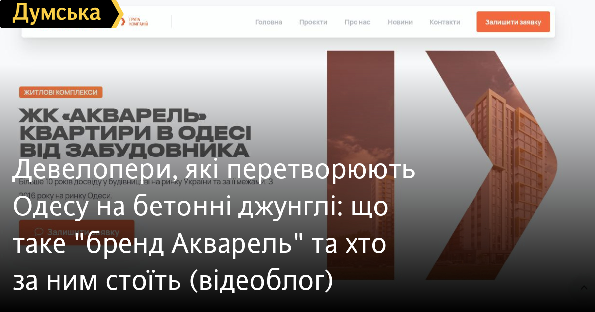 Девелопери, які перетворюють Одесу на бетонні джунглі: що таке «бренд Акварель» та хто за ним стоїть (відеоблог)Забудовники, які перетворюють Одесу на бетонні джунглі — хто вони? Інформацію про компанії та їх власників з відкритих джерел збирають та аналізують наші колеги з Першого міського телеканалу. Цей випуск відеоблогу присвячений «брендові Акварель». Принаймні, так називають себе самі автори мурашників із яскравими фасадами. На офіційному сайті написано: «Більше 10 років досвіду у будівництві на ринку України та за її межами. З 2016 року на ринку Одеси». Що, де та хто будував чотири роки до 2016 — незрозуміло, ніхто цього не уточнює. Всі розміщені тут об’єкти — це ті самі одеські та приміські житлові комплекси і один бізнес-центр. Далі — у розділі «Про нас» читаємо: «Бренд «Акварель» був створений в 2016 році. Під час роботи компанія масштабувалася більш ніж у 10 разів». Яка саме компанія — незрозуміло, бо далі автори цієї нісенітниці самі ж пишуть: «За період з 2018 до 2020 ГРУПА КОМПАНІЙ «Акварель» успішно масштабувалась. ДЕЯКІ ПОКАЗНИКИ зросли більш ніж в 10 разів». Тобто є якийсь «бренд Акварель», хоча копірайтом торгової марки він не позначений. Далі його називають компанією, яка масштабувалась удесятеро, а потім одразу пишуть про якусь групу компаній і вже увага «деякі показники, що зросли більш ніж у 10 разів». Або автори писали це нетверезі, або намагаються маніпулювати поняттями, щоправда невдало. Влітку 2017 року, коли компанія під цим «брендом» почала забудовувати поля поблизу Одеси, на Одеському форумі з’явилося декілька тем з тисячами коментарів з цього приводу. Тоді потенційні покупці житла намагалися більше дізнатися про нового забудовника. Хтось стверджував, що це продовження афери з «Набережним кварталом». Хтось писав, що за цим «брендом» стоїть група шахраїв, які надурили багато людей, зокрема військових, у Львові, а потім втекли до Хмельницького і ось дісталися й Одеси. Що з цього чорний піар, а що правда — сказати важко. Але вже зрозуміло одне — гучна заява про десятирічну історію і якийсь там мегабренд не має нічого спільного з реальністю. Детальніше про дозвільні документи на будівництво, розміщені на сайті, а також про фірми, які стоять за «брендом Акварель» і про їх власників — дивіться у відеоблозі.