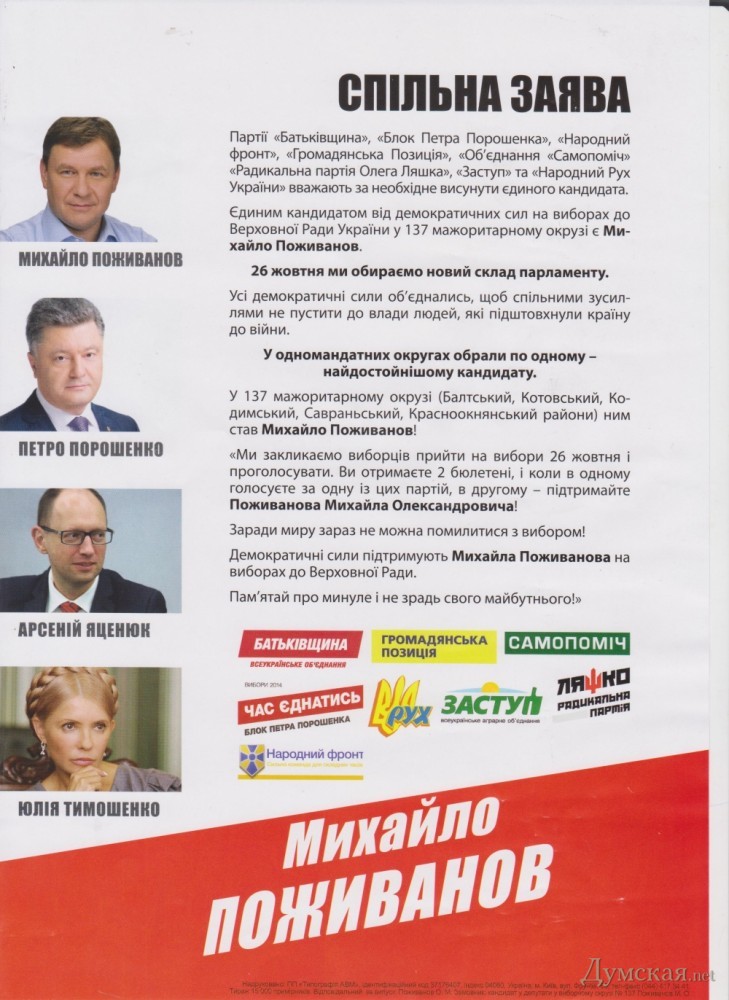 Областной штаб Блока Петра Порошенко назвал провокацией распространенные листовки, в которых говорится, что политические силы демократического лагеря выдвинули в качестве единого кандидата по 137 округу Михаила Поживанова. Об этом в своем обращении к избирателям округа заявил глава областного штаба Блока Петра Порошенко Алексей Гончаренко. «Сегодня в 137-м избирательном округе — это Котовск, Кодыма, Саврань, Балта, Красные Окна – происходят провокации. Один из кандидатов-самовыдвиженцев присваивает себе звание единого кандидата от демократических сил. Распространяются листовки о том, что его поддерживают якобы партии демократического лагеря, в том числе наша партия – Блок Петра Порошенко. Я хочу сказать, что наша партия на своем съезде выдвинула одного кандидата. Это Понепалюк Валерий Васильевич, который сегодня баллотируется в вашем округе, местный, котовчанин, житель этого округа, человек, который пользуется доверием и уважением своих соседей. Сегодня я призываю вас поддержать его, как действительного кандидата от демократических сил», — заявил Гончаренко. По словам Алексея Гончаренко, партия «Народный фронт» сняла своего кандидата в 137 округе в пользу Понепалюка. «Для того, чтобы не пропустить в Верховную Раду действующего депутата от этого округа Леонида Климова», — добавил глава штаба. СМЕРТЬ РОСІЙСЬКИМ ОКУПАНТАМ! Помітили помилку? Виділяйте слова з помилкою та натискайте control-enter |