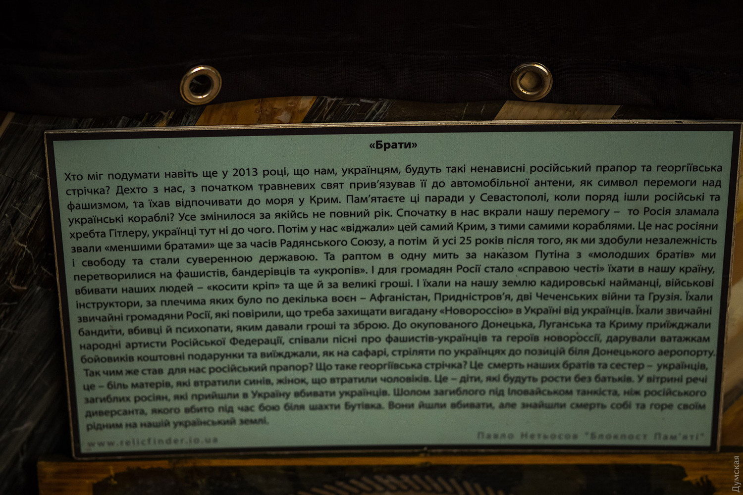«Блокпост памяти»: в Одессе открылась выставка личных вещей солдат, погибших в российско-украинской войнеВыставка «Блокпост памяти», посвященная событиям российско-украинской войны, открылась в помещении военно-исторического музея оперативного командования Юг. Основой экспозиции стали личные вещи солдат, собранные волонтерами миссии «Эвакуация- 200» при поиске и транспортировке тел погибших с оккупированных территорий Донецкой и Луганской областей. За четыре года — более 1,5 тысяч тел павших. Для каждого воина — своя витрина, роль которой выполняет гранатный ящик. Документы, шевроны, награды, фотографии и личные вещи наших военных, тех, которые уже никогда не вернутся домой живыми. За каждым ящиком — история человека, отдавшего свою жизнь за нашу страну. Как рассказал «Думской» организатор выставки, сотрудник национального военно-исторического музея Украины, руководитель поисковой группы «Эвакуация — 200» Павел Нетесов, выставка разделена на две части. «В одних ящиках предметы, которые мы собирали на поле боя, — рассказывает Павел. — Вторая часть — личные вещи, которые передали нам родные и близкие тех парней, которых мы вернули домой. Каждая вещь, которую вы здесь видите — это доказательства. Она имеет свою фото- и видеофиксацию места, где была найдена и связана с людьми, которые погибли в 2014 году и гибнут до сих пор». В честь открытия выставки один из волонтеров, собиравших тела павших воинов на поле боя в 2014 году, Александр Попов получил награду от генерального штаба ВСУ. «Александр — не солдат, он обычный человек, который приехал и работал с нами не одну неделю, рискуя каждый день, общаясь с людьми на той стороне, своими руками собирая останки парней, чтобы они вернулись домой, — рассказал подполковник Владислав Назаров, вручавший награду. — Говоря о выставке, мое главное желание — чтобы она не пополнялась». Выставка будет работать в течение двух месяцев. Каждый час будет проводиться экскурсия с гидом. Фото — Александр Гиманов СМЕРТЬ РОСІЙСЬКИМ ОКУПАНТАМ! Помітили помилку? Виділяйте слова з помилкою та натискайте control-enter |