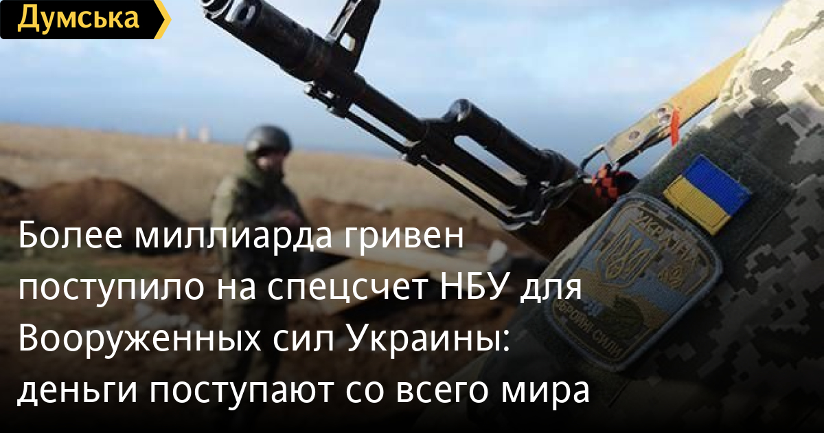 Более миллиарда гривен поступило на спецсчет НБУ для Вооруженных сил Украины: деньги поступают со всего мираНа спецсчет НБУ для Вооруженных сил Украины перечислено более миллиарда гривен. Об этом сообщает пресс-служба Национального банка Украины. Часть этих средств — 450 млн гривен — НБУ уже перечислил на нужды Национальной гвардии. Средства поступали как от граждан и предприятий в Украине, так и от международного сообщества — из США, Великобритании, Польши, Германии, Швеции, Финляндии, Чехии, Китая, Франции, Канады и еще многих стран мира. «Помочь Вооруженным силам Украины можно просто, осуществив перевод посредством платежной карты любого банка любой страны мира, и средства поступят на специальный счет Национального банка. Перечислить средства онлайн с помощью платежной карты можно здесь», — сообщают в НБУ. СМЕРТЬ РОССИЙСКИМ ОККУПАНТАМ! Заметили ошибку? Выделяйте слова с ошибкой и нажимайте control-enter |