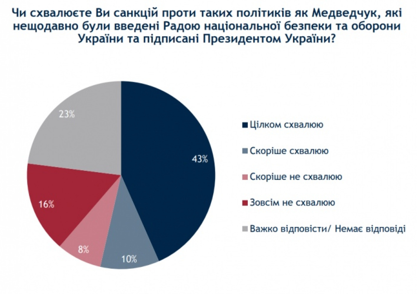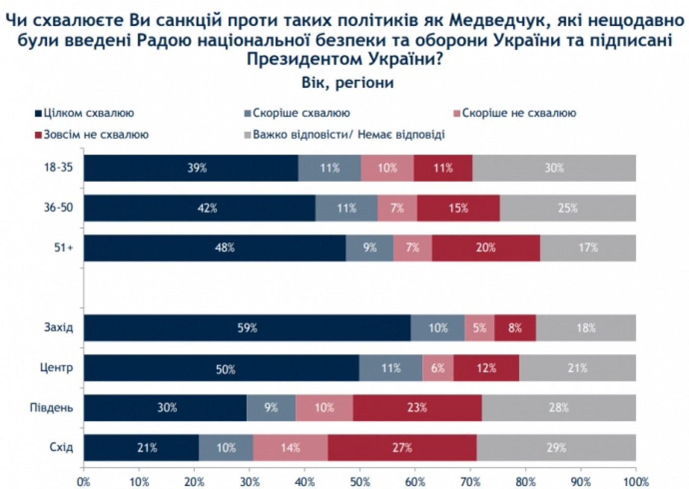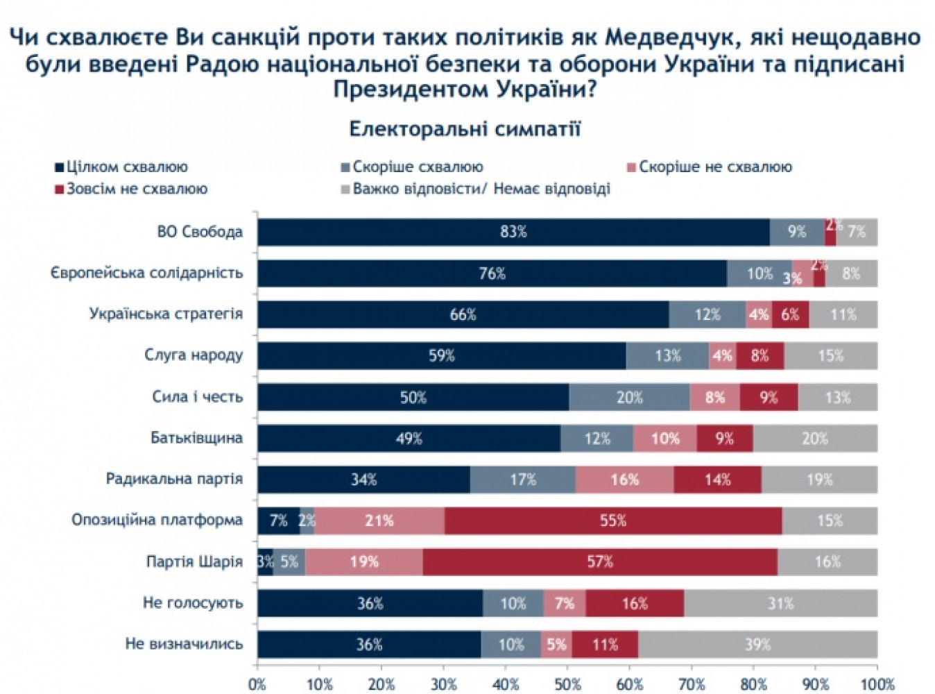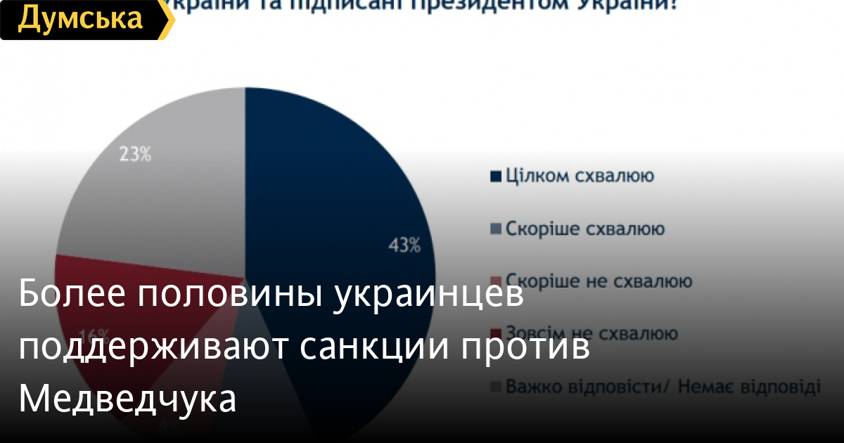 53% опрошенных украинцев одобряют санкции против таких политиков как председатель политсовета «Оппозиционной платформы — За жизнь» Виктор Медведчук, которые были введены Советом национальной безопасности и обороны, а 44% поддерживают санкции против его телеканалов. Об этом свидетельствуют данные социологического опроса группы «Рейтинг» по заказу Центра анализа и социологических исследований Международного республиканского института. Согласно опубликованным данным вполне одобряют санкции против Медведчука 43% респондентов, еще 10% - «скорее одобряют». Почти четверть украинцев против санкций — совсем не одобряют их 16%, скорее не одобряют — 8%. Среди опрошенных 23% не смогли ответить на вопрос. Больше всего одобряют санкции жители запада Украины — 69%, больше всего не одобряют — на востоке (41%). По возрастам, то украинцы от 51 года всего как поддерживают (57%) так и не поддерживают (27%) санкции. Наибольшие противники блокировки телеканалов на востоке Украины (57%) и на юге (51%).