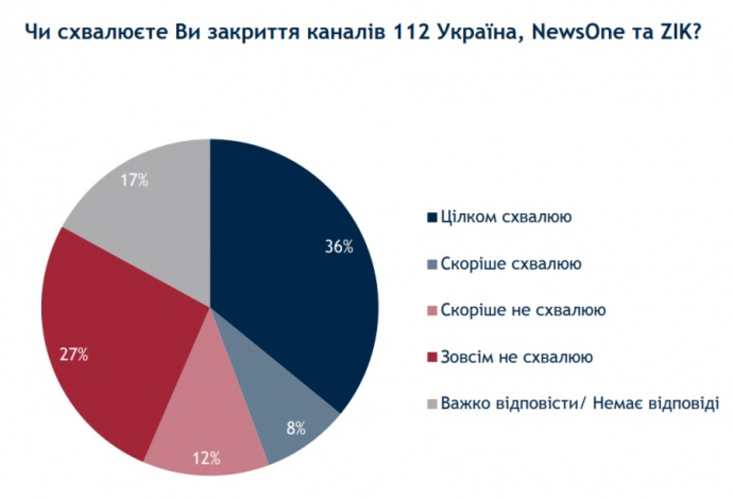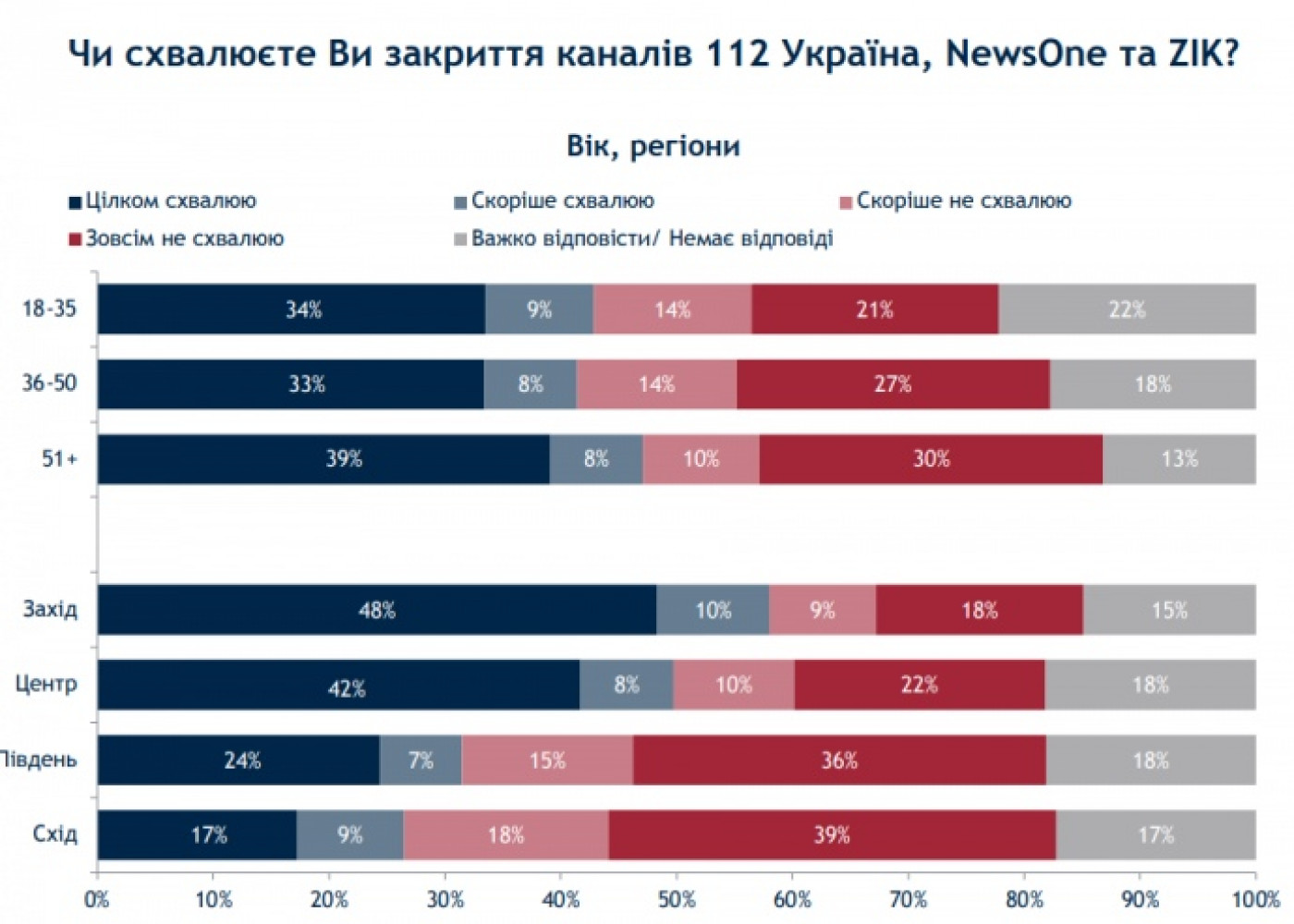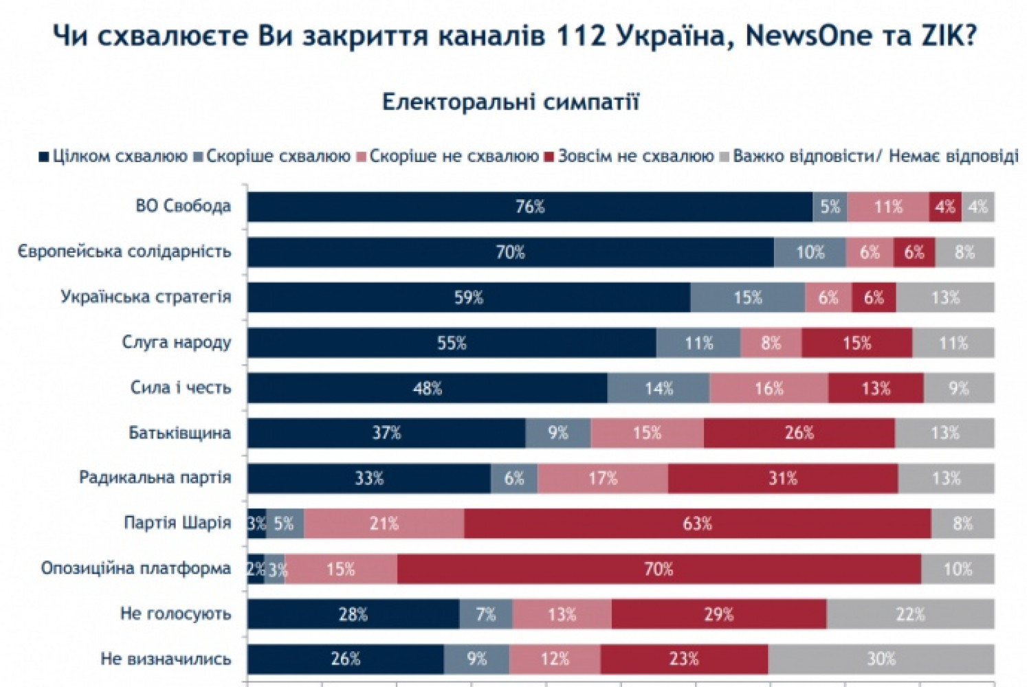 53% опрошенных украинцев одобряют санкции против таких политиков как председатель политсовета «Оппозиционной платформы — За жизнь» Виктор Медведчук, которые были введены Советом национальной безопасности и обороны, а 44% поддерживают санкции против его телеканалов. Об этом свидетельствуют данные социологического опроса группы «Рейтинг» по заказу Центра анализа и социологических исследований Международного республиканского института. Согласно опубликованным данным вполне одобряют санкции против Медведчука 43% респондентов, еще 10% - «скорее одобряют». Почти четверть украинцев против санкций — совсем не одобряют их 16%, скорее не одобряют — 8%. Среди опрошенных 23% не смогли ответить на вопрос. Больше всего одобряют санкции жители запада Украины — 69%, больше всего не одобряют — на востоке (41%). По возрастам, то украинцы от 51 года всего как поддерживают (57%) так и не поддерживают (27%) санкции. Наибольшие противники блокировки телеканалов на востоке Украины (57%) и на юге (51%).