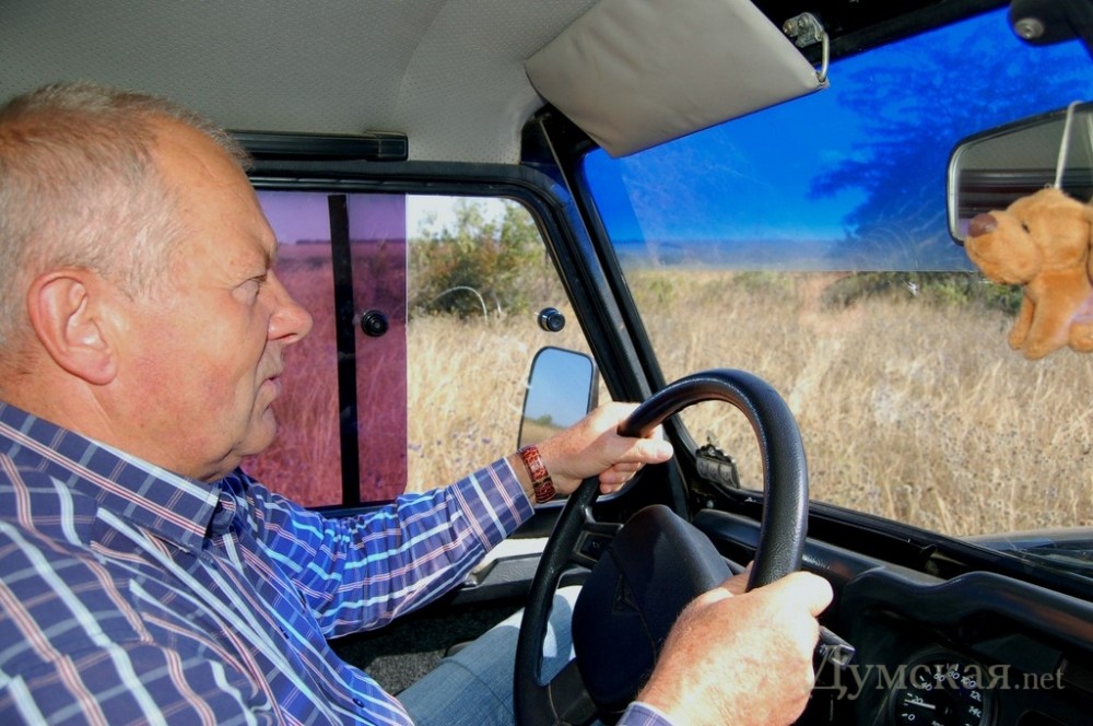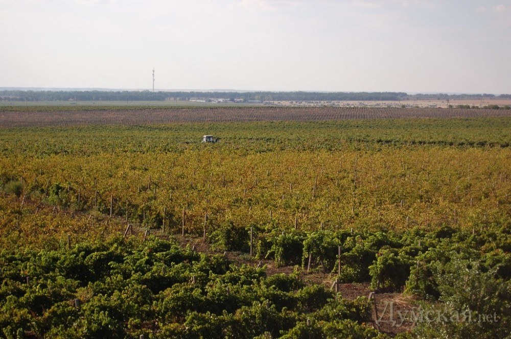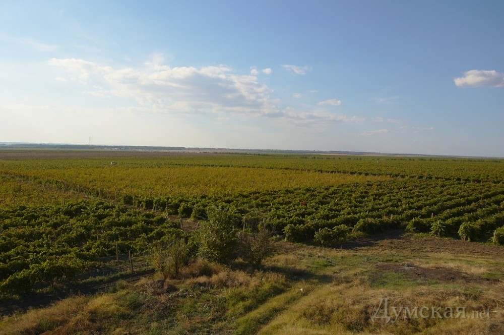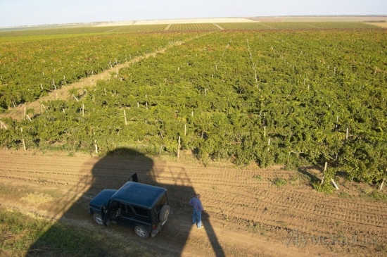 Размеры полигона, конечно, впечатляют. Огромное поле площадью больше ста квадратных километров окинуть взглядом невозможно. «Нам в наследство досталась вышка, с которой командование наблюдало за учениями. Кто-то предлагал распилить ее на металлолом, но я сохранил. С нее очень удобно смотреть за полями», — говорит Белоус. Поднимаюсь на вышку. Пейзаж завораживающий. Во все стороны — бескрайние поля с ровными рядами виноградников. Неподалеку — маленькая коробочка трактора. Там работает бригада.