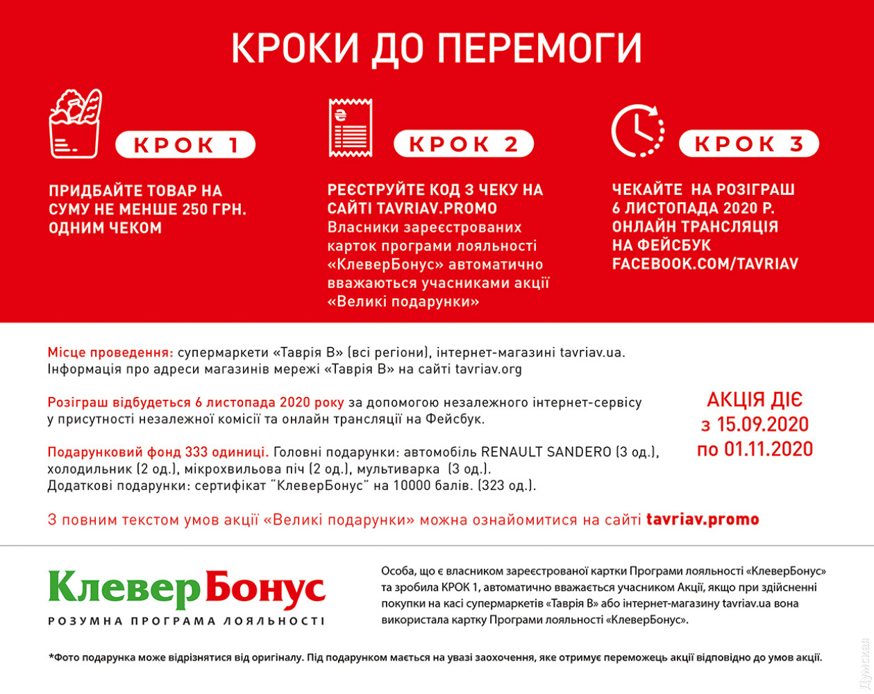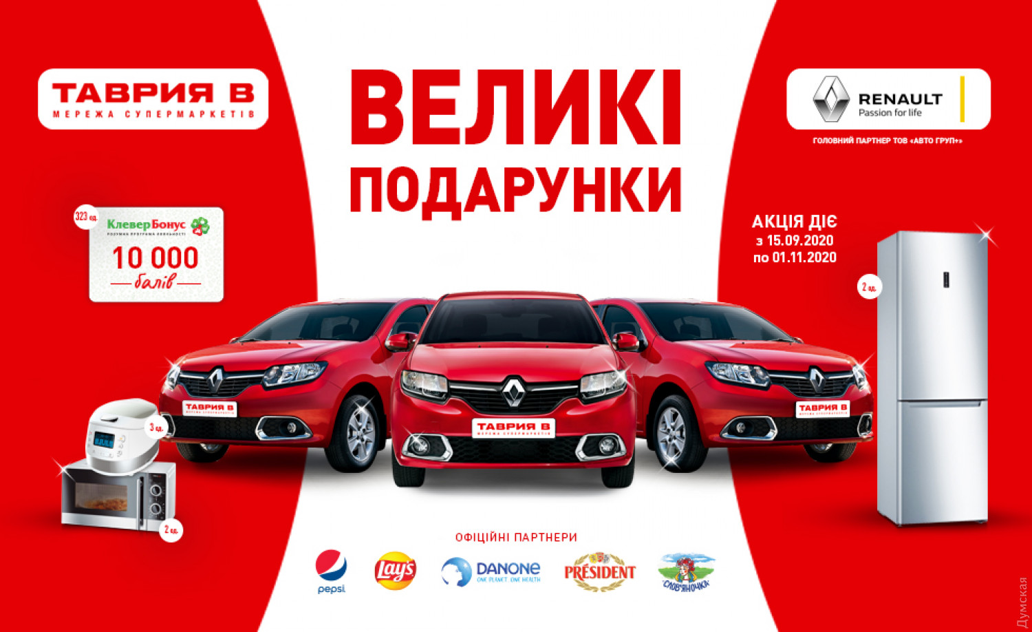 «Великі подарунки» от ТАВРИЯ В: сеть супермаркетов разыгрывает три автомобиля и кухонную техникуСеть супермаркетов ТАВРИЯ В объявила старт акции «Большие подарки», которая продлится до 1 ноября. Розыгрыш призов состоится 6 ноября на странице сети супермаркетов в «Фейсбуке». Главными призами станут три автомобиля Renault Sandero, кроме того, можно заполучить два холодильника, три мультварки, две микроволновые печи и 323 пополнения карт «КлеверБонус» на 10000 баллов. В течение этого месяца каждый посетитель супермаркетов ТАВРИЯ В может стать участником розыгрыша, если купит товары одним чеком на сумму более 250 гривен. После этого, код из чека нужно будет зарегистрировать на сайте tavriav.promo. Если вы использовали при покупке карту «КлеверБонус», то вы уже автоматически являетесь участником акции. Всем удачи. СМЕРТЬ РОСІЙСЬКИМ ОКУПАНТАМ! Помітили помилку? Виділяйте слова з помилкою та натискайте control-enter |
