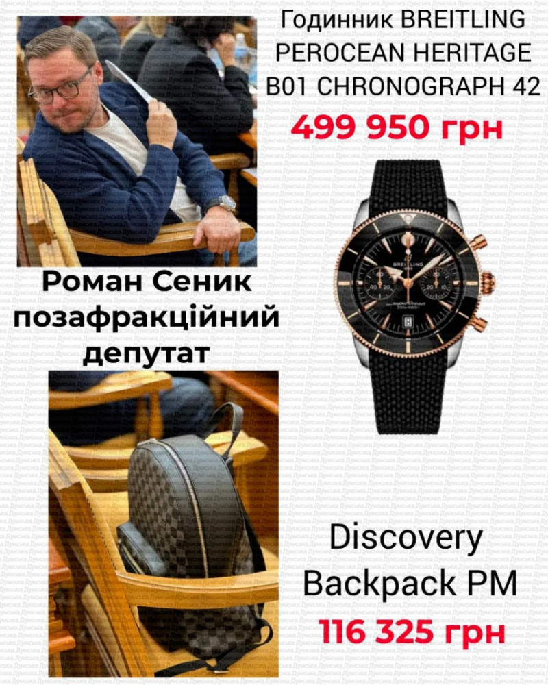 Серед помічених предметів, наприклад, годинник Tissot Heritage Prince вартістю близько 276 тисяч гривень, а також Rolex Yacht-Master Regatta, ціна яких досягає 1 мільйона 52 тисяч гривень. У депутатів були сумки Louis Vuitton, а також жіноча сумка Gucci Marmont Medium орієнтовною вартістю 141 тисяча гривень.