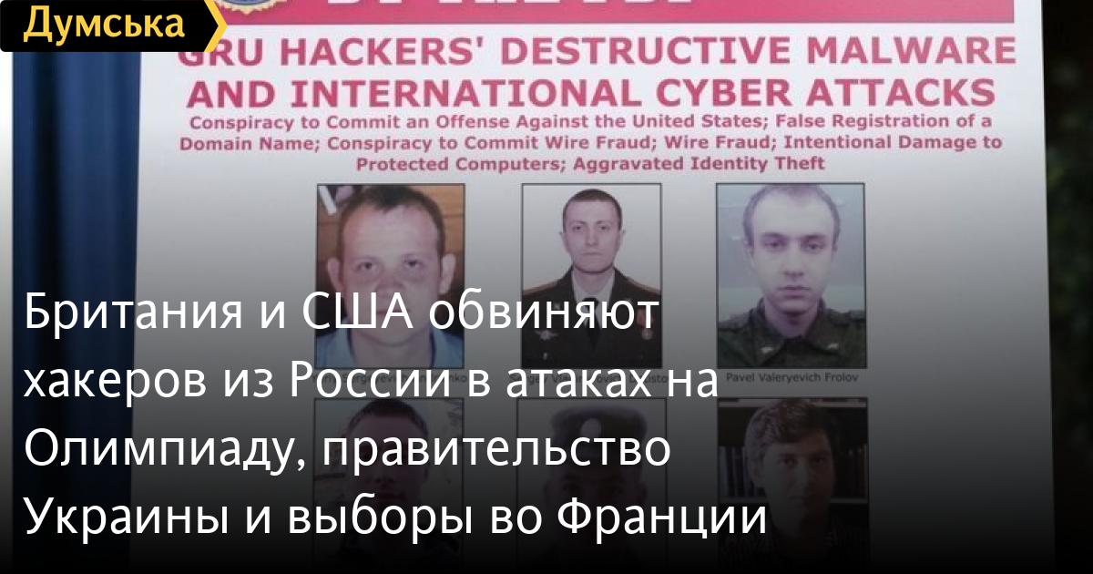 Британия и США обвиняют хакеров из России в атаках на Олимпиаду, правительство Украины и выборы во ФранцииВласти Великобритании и США одновременно выдвинули обвинения в отношении шести россиян, которых они считают сотрудниками ГРУ, в связи с хакерскими атаками на сайты нескольких Олимпиад, а также на предвыборный штаб нынешнего президента Франции. Как сообщает ВВС, министерство юстиции США выдвинуло обвинения против шестерых граждан России по делу о хакерских атаках, направленных на зимнюю Олимпиаду в Пхенчхане в 2018 году, на сайт правительства Украины и выборы президента Франции в 2017 году. По информации британских спецслужб, россияне входили в специальное подразделение номер 74455 Главного разведывательного управления РФ. Британские власти также связали это подразделение с атаками на киберинфраструктуру следующей Олимпиады в Токио, перенесенной на 2021 год из-за пандемии. Из российских официальных лиц первым отреагировал председатель комитета Госдумы по международным делам Леонид Слуцкий, который назвал обвинения бездоказательными и «очередным шагом по дискредитации Москвы». «Ни одна страна не реализовывала свои кибернетические амбиции столь злонамеренно и безответственно, как Россия, причиняя беспрецедентный ущерб ради небольших тактических преимуществ и удовлетворяя приступы злобы», — заявил заместитель генпрокурора США Джон Демерс. В Пхенчхане сотрудники киберподразделения ГРУ под видом северокорейских и китайских хакеров попытались обрушить сайт Олимпиады и отключить wi-fi на стадионе во время церемонии открытия Игр. Ключевыми целями российских хакеров были телеканалы, горные курорты, олимпийские чиновники и спонсоры соревнований. «Действия ГРУ против Олимпийских и Паралимпийских игр циничны и безрассудны. Мы осуждаем их самым решительным образом», — заявил министр иностранных дел Британии Доминик Рааб. По данным минюста США, помимо Олимпиады хакеры атаковали серверы правительства Украины, в 2017 году — предвыборный штаб Эммануэля Макрона, избранного тогда президентом Франции, а в 2018 году их мишенью стали грузинские компании и ведомства. Те же обвиняемые стояли за рассылкой фишинговых сообщений в апреле 2018 года с целью взлома сети Организации по запрещению химического оружия (ОЗХО), расследовавшей отравление Сергея и Юлии Скрипалей в Солсбери. Кроме этого, американские власти обвиняют россиян в создании компьютерного вируса NotPetya, который заразил серверы десятков крупнейших мировых компаний. Ущерб от него оценивается в миллиард долларов. В обвинительном заключении перечислены имена обвиняемых. В обратной транслитерации с английского они выглядят следующим образом: Юрий Сергеевич Андриенко Сергей Владимирович Детистов Павел Валерьевич Фролов Анатолий Сергеевич Ковалев Артем Валерьевич Очиченко Петр Николаевич Плискин. Трое из шести обвиняются в создании вируса NotPetya и других вредоносных программ. Детистов, Ковалев и Очиченко обвиняются в фишинговых атаках — создании фиктивных имейлов, призванных выведать пароли доступа у сотрудников организаций. Ковалеву в 2018 году в США были предъявлены обвинения в связи с вмешательством в американские президентские выборы 2016 года. Спецчасть ГРУ под номером 74455 ранее уже фигурировала в сообщениях американского минюста — в частности, в июле 2018 года ведом