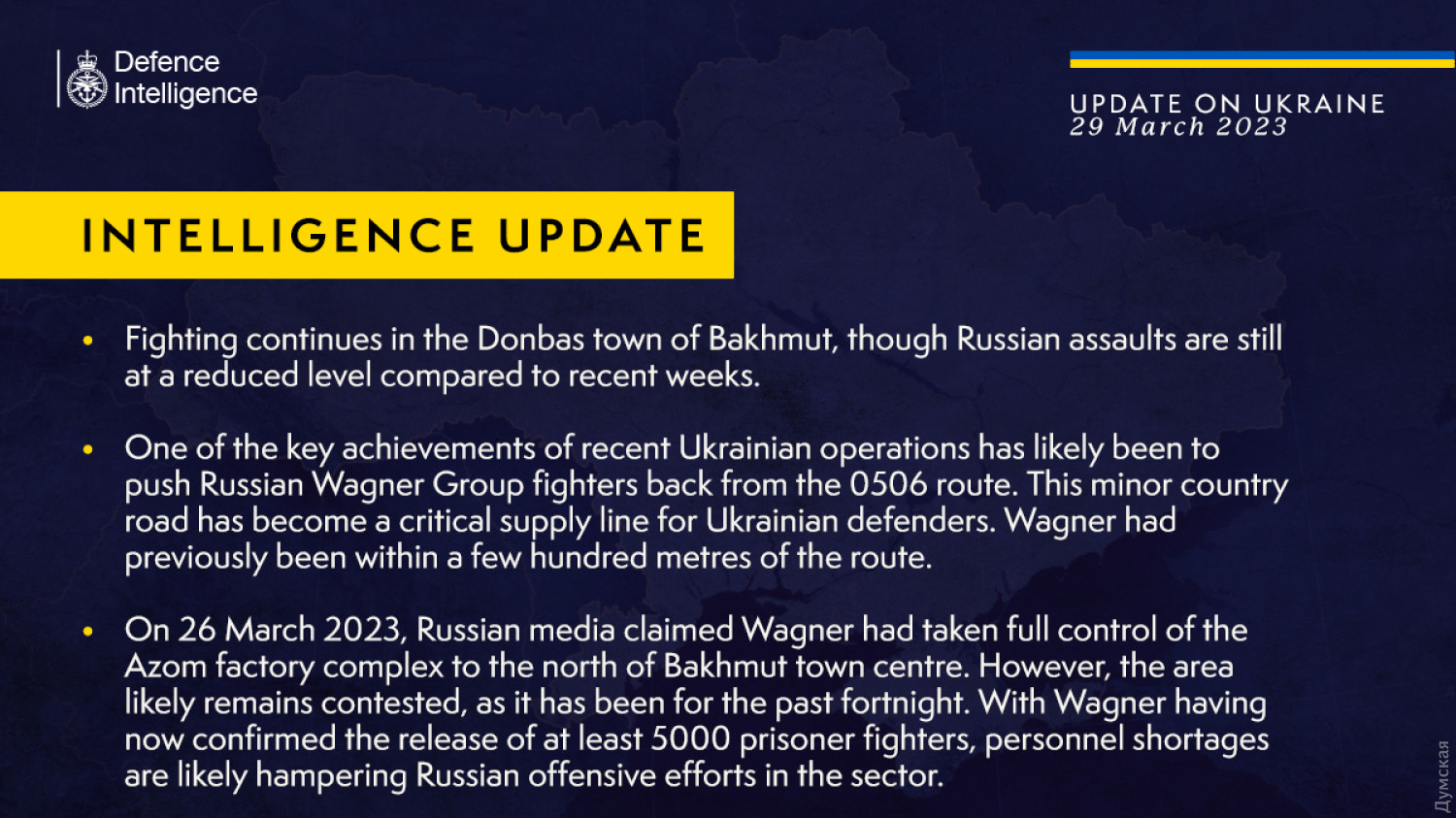 Британська розвідка повідомляє, що тривають запеклі бої в районі заводу АЗОМ на північ від центру Бахмута. Аналітики вважають, що «Вагнер» відчуває серйозний дефіцит живої сили в районі Бахмута — нещодавно піврічний контракт у ПВК закінчився у п'яти тисяч ув'язнених.