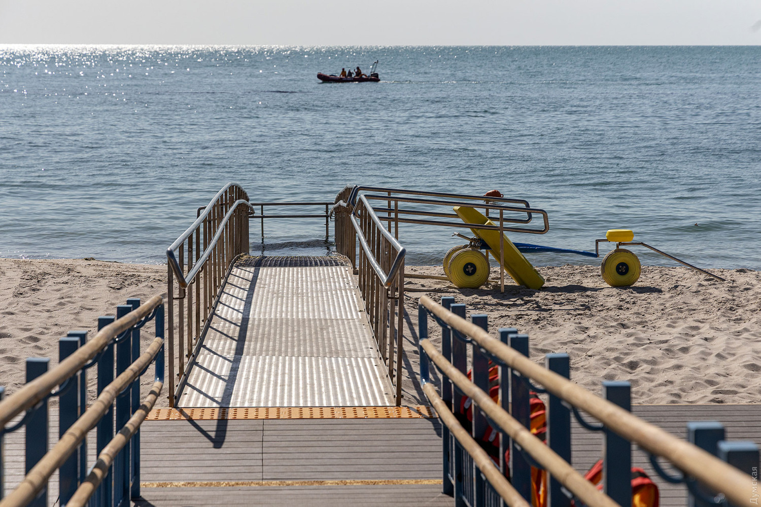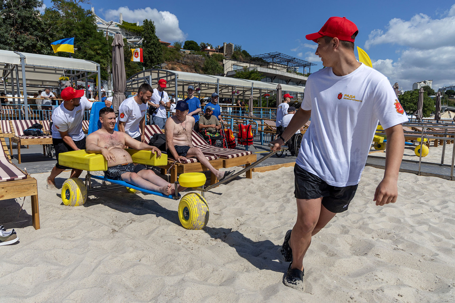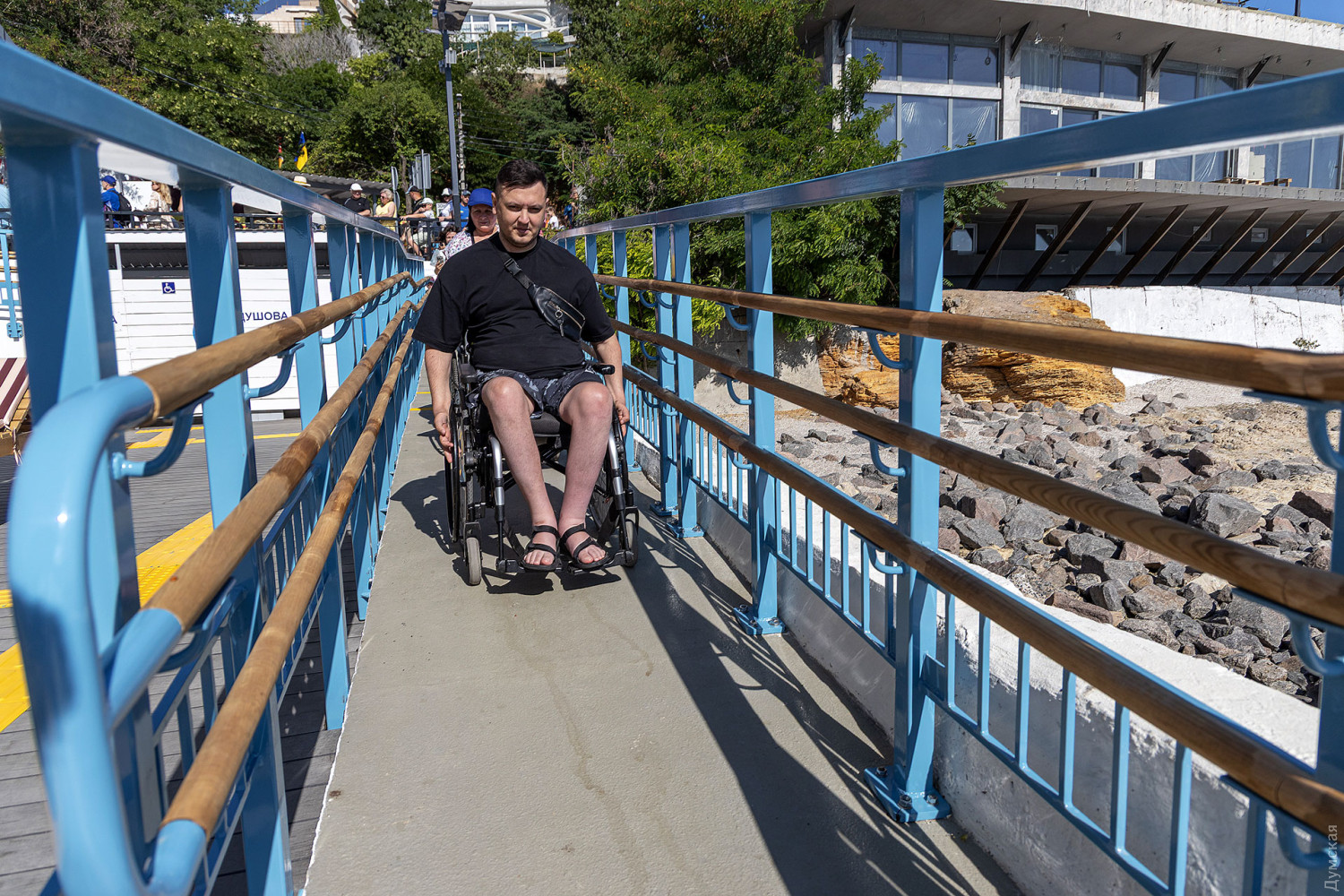 Громадський діяч і стендап комік Юрій Степанець став одним із перших, хто протестував інфраструктуру пляжу на своєму мобільному візку. Чоловіка доставили в море на спеціальній плавучій тачці, яка здатна пересуватися піском.