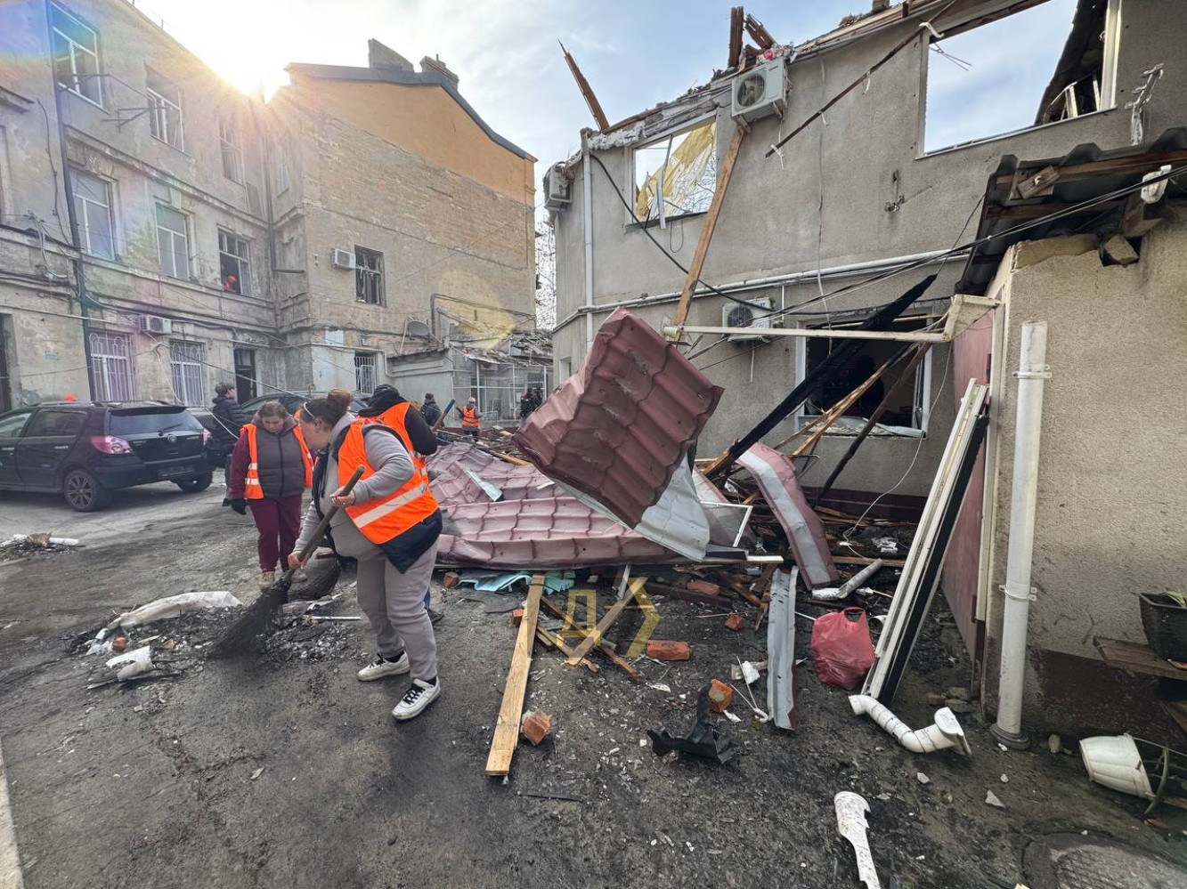 Взрывными волнами повреждено около 270 окон. К ликвидации последствий атаки привлечены около 200 работников городских коммунальных предприятий и 14 единиц специальной техники. Продолжается расчистка территорий, коммунальные службы уже закрыли пленкой и OSB-плитами 95 оконных проемов.