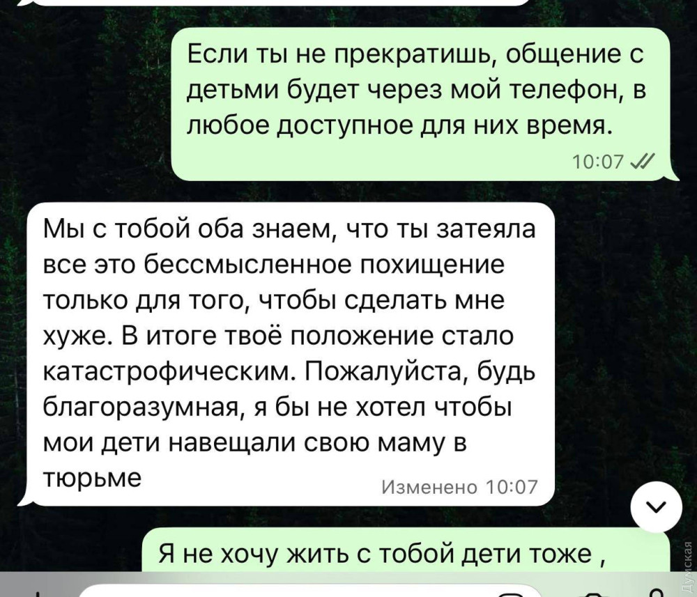 Колишня дружина одеського мільйонера Андрія Ветряка заявила про погрози та спробу позбавити її батьківських прав (відео)Колишня дружина одеського бізнесмена і трейдера Андрія Ветряка – Вероніка Ветряк – записала відеозвернення, в якому заявила, що побоюється за своє життя і безпеку своїх дітей. За словами жінки, колишній чоловік намагається позбавити її батьківських прав, використовуючи свої зв'язки та фінансові можливості. «Я записую це звернення, тому що не бачу іншого виходу: я і мої діти перебуваємо в небезпеці», – стверджує Вероніка у відео, яке вона оприлюднила в соцмережах. За інформацією, озвученою жінкою, з 2015 по 2024 рік вона перебувала у шлюбі з Андрієм Ветряком, відомим в українських бізнес-колах трейдером. Після початку повномасштабного вторгнення пара проживала в Іспанії, де й оформила розлучення. Попри розставання, експодружжя продовжувало жити під одним дахом і разом виховувало двох неповнолітніх дітей. Влітку 2025 року жінка повернулася з дітьми до Одеси. За її словами, рівень психологічного тиску та агресії з боку колишнього чоловіка став нестерпним. «Я була полонянкою у власному домі Постійні скандали, агресія, сцени на очах дітей», – каже вона. Після повернення в Україну тиск не припинився – за заявами колишнього чоловіка, вона стала фігурантом розслідувань у поліції, в тому числі за статтею про торгівлю людьми. Жінка стверджує, що отримує постійні погрози – в'язницею, психіатричною лікарнею, позбавленням прав і засобів до існування. «Мені не залишили вибору. Я боюся за своє життя, але більше мовчати не можу», – каже жінка. За даними «Думської», сторони подали взаємні позови до судових інстанцій України та однієї з європейських країн. На підтвердження своїх слів Вероніка надала фрагменти листування та записів, де, за її словами, зафіксовані погрози з боку колишнього чоловіка. «Думська» готова опублікувати позицію Андрія Ветряка в разі її надання. За даними порталу «Латифундист», бізнесмен розпочав свою кар'єру менеджером у «Правэкс Банку», де займався розвитком регіональних відділень. У 2003 році — очолив відділ роздрібної торгівлі в «Укрпромбанку», з 2005 по 2007 рр. - працював заступником голови правління «СоцКомБанк». З 2018 р. - співвласник агротрейдингової та логістичної компанії Qortia AG (Швейцарія); З 2020 р. – власник компанії «Лоджистик Віта» (м. Одеса). З 2021 р. – Андрій Ветряк співвласник компанії «Грін Віта» (оптова торгівля зерном). СМЕРТЬ РОСІЙСЬКИМ ОКУПАНТАМ! Помітили помилку? Виділяйте слова з помилкою та натискайте control-enter |