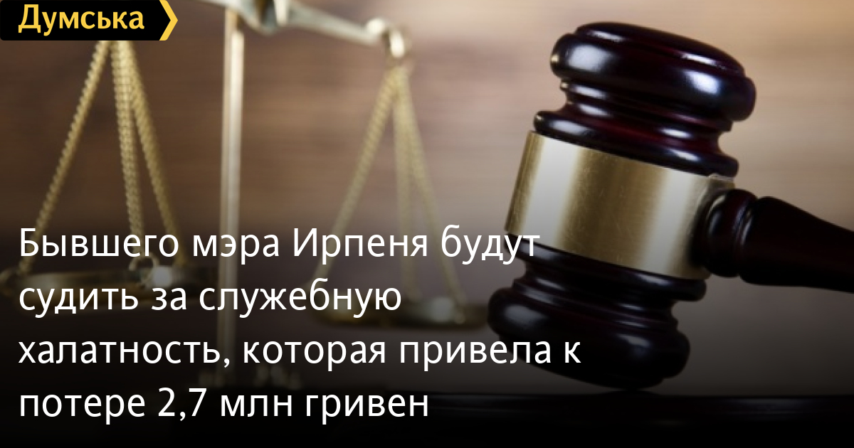 Бывшего мэра Ирпеня будут судить за служебную халатность, которая привела к потере 2,7 млн гривенПрокуратура направила в суд обвинительный акт в уголовном производстве в отношении бывшего мэра Ирпеня по факту служебной халатности, которая повлекла тяжкие последствия. Об этом сообщила пресс-служба Офиса генерального прокурора. Следствие установило, что в июле 2017 года бывший городской голова Ирпеня согласовал и подписал акты приема выполненных строительных работ по капремонту дороги на одной из улиц города. В результате этого подрядчику перечислили бюджетные средства в размере более 2,7 млн гривен за работу, которая фактически не была выполнена. Досудебное расследование проводил следственный отдел Ирпенского отдела полиции ГУ Нацполиции в Киевской области. СМЕРТЬ РОССИЙСКИМ ОККУПАНТАМ! Заметили ошибку? Выделяйте слова с ошибкой и нажимайте control-enter |