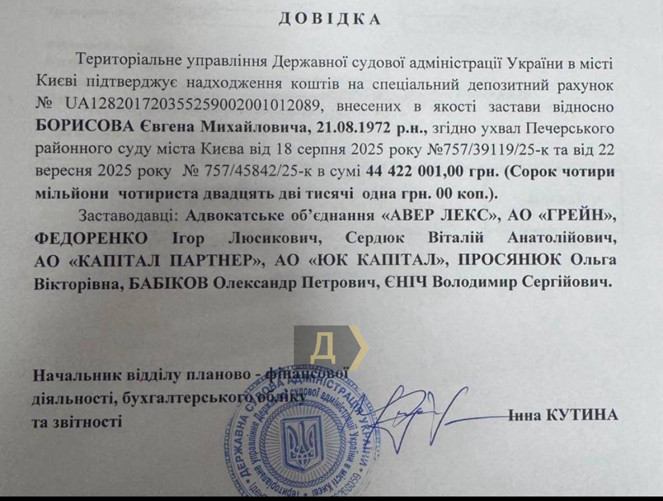 Адвокати Януковича та ексзаступник директора ДБР заплатили заставу за одеського військкома Борисова, але його захисник це спростовує (оновлено)Заставу у 44 млн грн внесли за скандального одеського військкома Євгена Борисова. Журналіст Євген Плінський опублікував довідку Судової адміністрації, за якою гроші дали адвокати Януковича. При цьому захисник Борисова Олександр Маковецький цю інформацію заперечує, пише «Суспільне». За словами захисника Олександра Маковецького, його клієнт продовжує перебувати у слідчому ізоляторі. «Ніхто не вносив застави. Він досі у СІЗО. Таких грошей немає», — повідомив адвокат. В документі оприлюдненому Плінським ідеться про адвокатське об'єднання Aver Lex та пов'язані з ними фізичні та юридичні особи. Зокрема, це юристи Ігор Федоренко, Віталій Сердюк, Ольга Просянук, Володимир Єніч. Крім того, серед них Олександр Бабіков — колишній заступник директора Державного бюро розслідувань, який як адвокат захищав Януковича, а як детектив ДБР - розслідував справу Небесної Сотні. А ще він боржник з аліментів. Нагадаємо, Борисова затримали 24 липня 2023 року в Києві. Кілька днів тому йому повідомили про підозру в незаконному збагаченні. 25 липня його відправили до СІЗО. Журналісти з'ясували, що сім'я Борисова під час воєнного стану в країні придбала елітну нерухомість в Іспанії. Його мати-пенсіонерка стала власницею вілли в Марбельї за чотири мільйони євро, а дружина — офісного приміщення на центральній вулиці курортного міста. Крім того, автопарк сім'ї поповнився трьома дорогими іномарками. Після скандалу з'ясувалося, що син Борисова — керівник одного з підрозділів УСБУ в Одеській області. Наприкінці червня 2023 року Борисова звільнили з займаної посади. У липні 2024 року йому повідомили про підозру ще й у неявці на службу без поважних причин та ухиленні від несення обов'язків військової служби. Слідство встановило, що з 2 по 16 грудня 2022 року він не з'являвся на службу, а як поважну причину надав підроблену довідку про те, що ці два тижні провів у лікарні. Насправді ж з грудня 2022 року по січень 2023 року екс-військкома відпочивав з матір'ю і дружиною на Сейшелах і в Іспанії. СМЕРТЬ РОСІЙСЬКИМ ОКУПАНТАМ! Помітили помилку? Виділяйте слова з помилкою та натискайте control-enter |