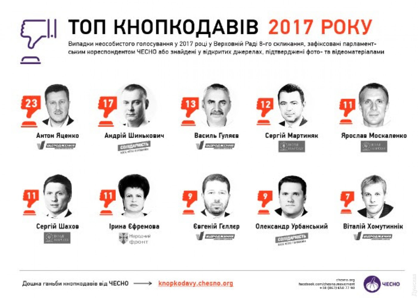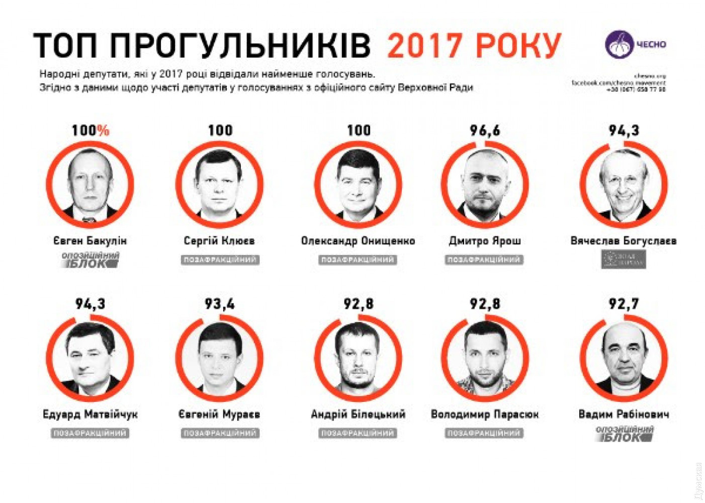 Бывший одесский губернатор Матвийчук вошел в ТОП прогульщиков Рады: в 2017 году он почти не работал в парламентеЭкс-председатель Одесской ОГА и народный депутат Украины Эдуард Матвийчук вошел в список самых заядлых прогульщиков Верховной Рады в уходящем 2017 году. Такие данные приводят участники общественного движения «Честно». Согласно исследованию, Матвийчук пропустил 94,3% парламентских заседаний. 100% заседаний прогуляли нардеп от «ОппоБлока» Евгений Бакулин и внефракционные депутаты Сергей Клюев и Александр Онищенко. Отметим, в 2016 году, согласно отчету КИУ, лидером по прогулам среди одесских нардепов был Иван Фурсин. Составили также ТОП-2017 кнопкодавов Верховной Рады. Среди отличившихся одесский нардеп Василий Гуляев. Лидером же кнопкодавства стал нардеп от депутатской группы «Відродження» Антон Яценко, которого 23 раза уличили в голосовании за коллег. СМЕРТЬ РОСІЙСЬКИМ ОКУПАНТАМ! Помітили помилку? Виділяйте слова з помилкою та натискайте control-enter