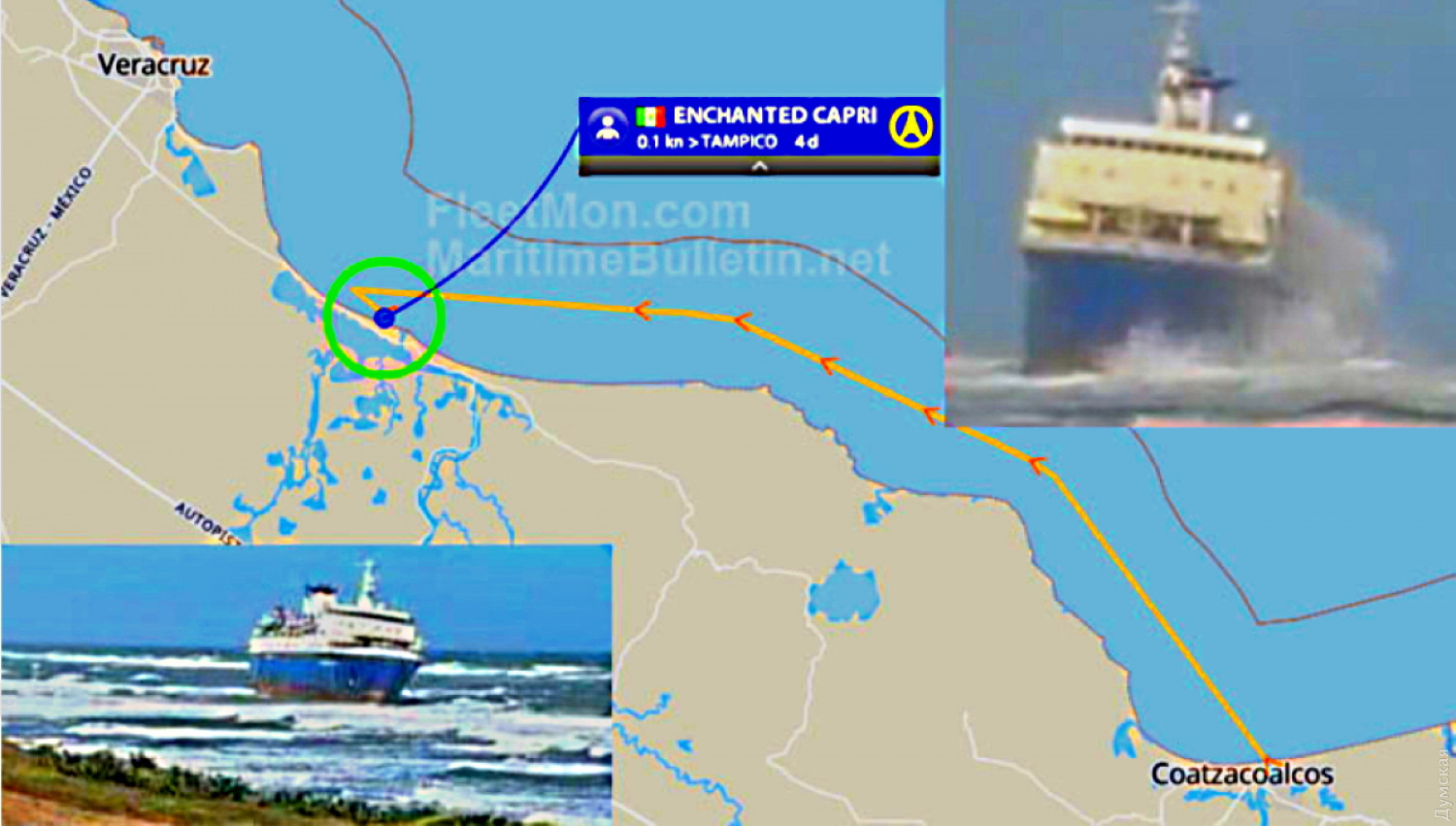 Круизный лайнер ENCHANTED CAPRI (флаг Мексики) сел на мель на пляже мексиканского муниципалитета Альварадо, штат Веракрус.