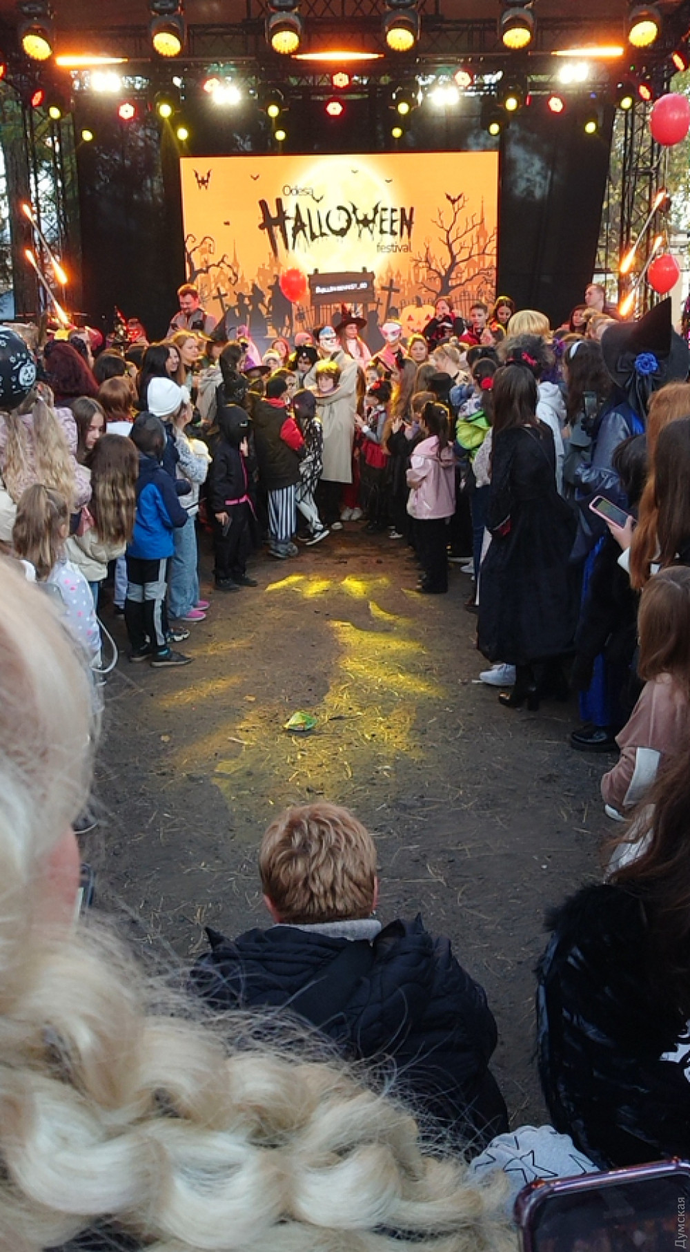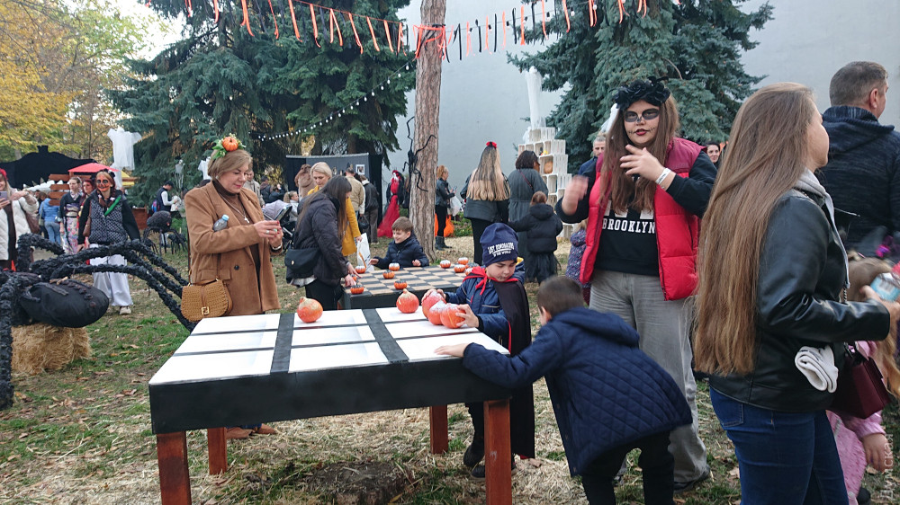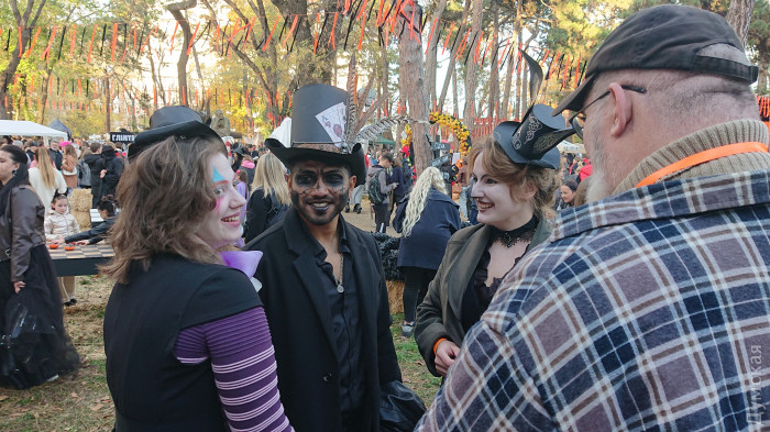Потолкавшись в очередях, мы вырвались наружу в Хэллоуин. Он сразу навалился на нас — запахом сена, шашлыков и глинтвейна, ором толпы и бодрыми мегафонными призывами ведущей на сцене.