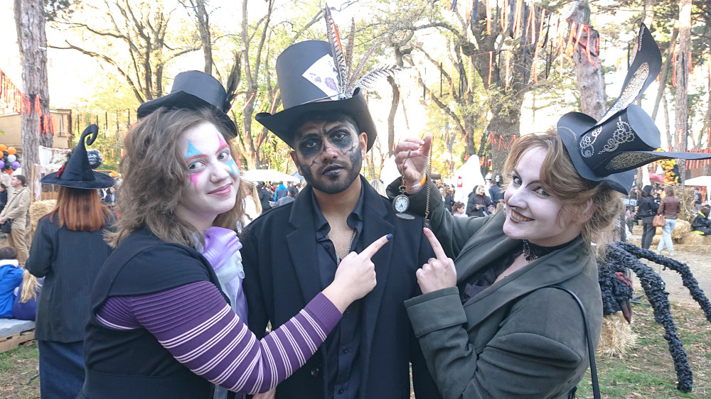 А вот еще троица. Одного узнаю по гриму — Барон Самеди, часть культа Вуду (я писал, как пытался с его помощью проклясть путина на позапрошлый Хэллоуин вот тут). Сам Барон — он же Сагим, студент медина из Индии, с двумя красавицами по бокам.