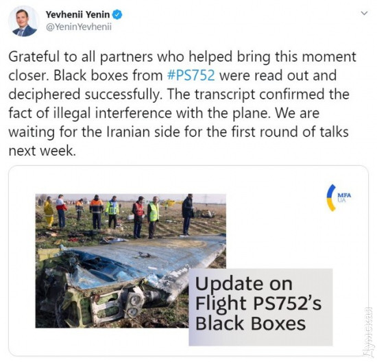 Черные ящики сбитого в Иране рейса МАУ успешно расшифровали: подтвердился факт незаконного вмешательства в самолетДанные из черных ящиков сбитого в Иране «Боинга» МАУ свидетельствуют, что произошло «незаконное повреждение самолета». Об этом заявил заместитель министра иностранных дел Евгений Енин в своем Twitter. «Благодарен всем партнерам, которые помогли приблизить этот момент. Черные ящики с #PS752 были успешно считаны и расшифрованы. Стенограмма подтвердила факт незаконного повреждения самолета», — отметил заместитель министра. Он также добавил, что Украина ожидает первый раунд переговоров с иранской стороной на следующей неделе. Напомним, Boeing авиакомпании МАУ, который должен был выполнить рейс по маршруту Тегеран-Киев, разбился 8 января 2020 года после взлета из тегеранского аэропорта Хомейни. На борту находились 168 пассажиров и 9 членов экипажа, все они погибли. Большинство погибших в авиакатастрофе — граждане Канады и Ирана. Только спустя три дня Иран признал, что самолет украинских авиалиний был сбит по ошибке иранскими военными. Отметим, Иран склоняет Украину к подписанию меморандума о взаимопонимании. В нем нашей стране предлагается признать случившееся «человеческой ошибкой» и отказаться от судебных исков в обмен на выплату компенсации и обнародование данных черных ящиков. 6 июня заместитель министра иностранных дел по международным и правовым вопросам Мохсен Бахарванд заявил, что дело о сбитом в январе 2020 года под Тегераном самолете Международных авиалиний Украины почти закончено. В июле Иран доставил черный ящик сбитого самолета авиакомпании «Международные авиалинии Украины» во французское Бюро расследований и анализа безопасности гражданской авиации СМЕРТЬ РОССИЙСКИМ ОККУПАНТАМ! Заметили ошибку? Выделяйте слова с ошибкой и нажимайте control-enter |
