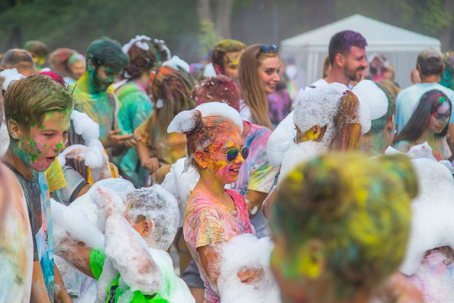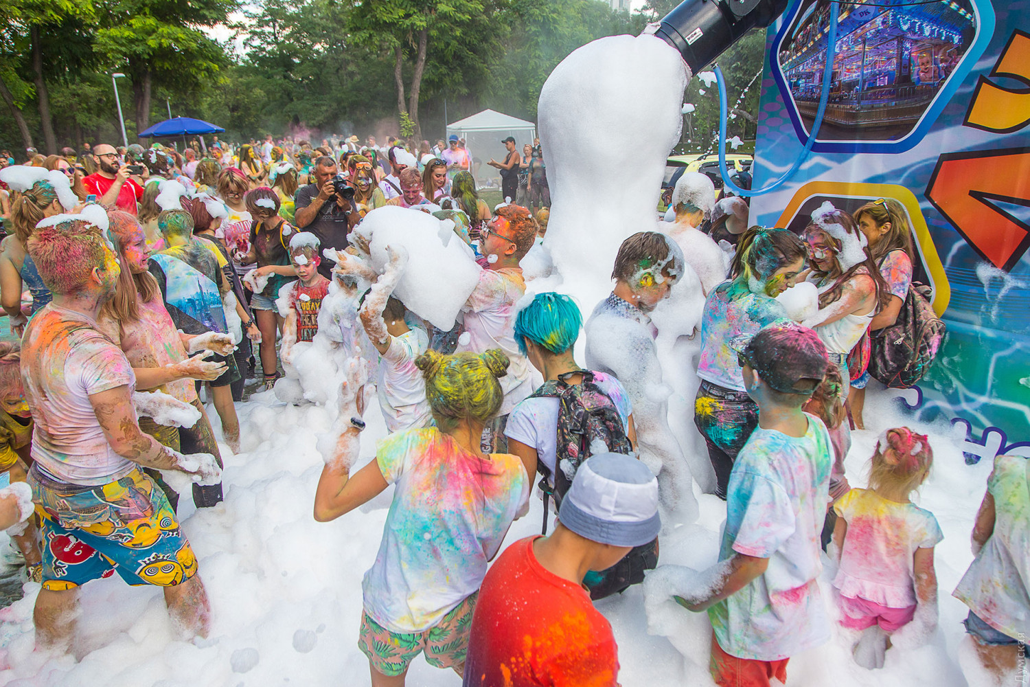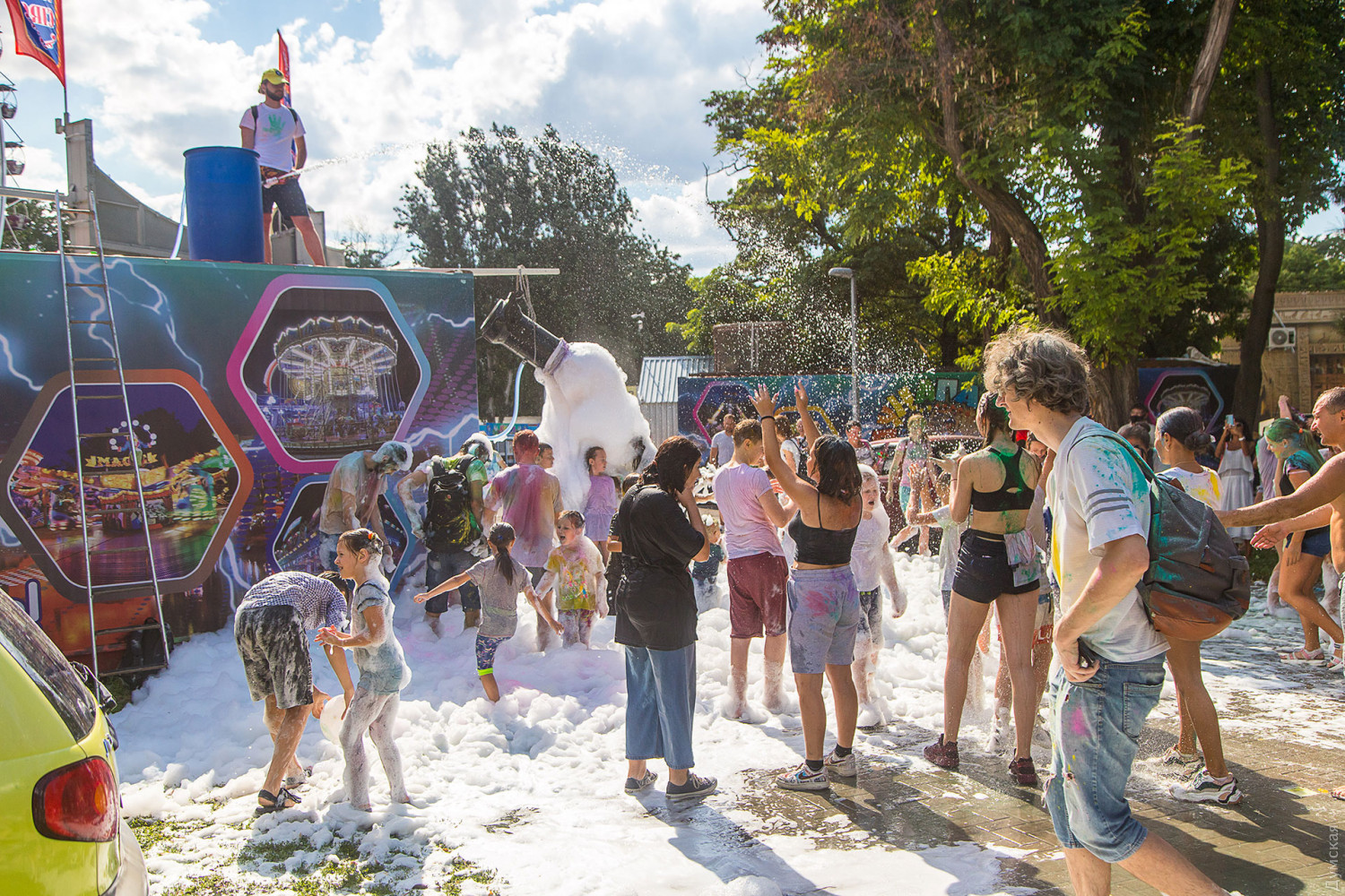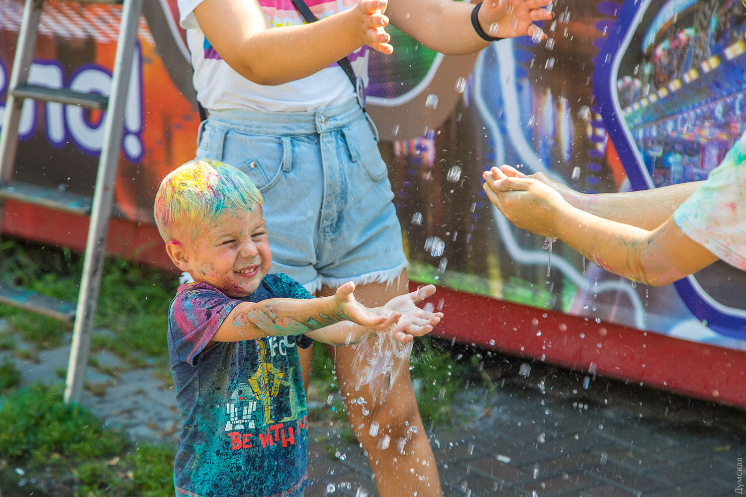 В самом начале мероприятия участников разделили на два условных лагеря, которые и схлестнулись по команде ведущего в красочном сражении. В конце мероприятия состоялась пенная вечеринка, а потом все желающие смогли смыть следы сражения и заодно охладиться. Для этого уже традиционно приехала машина одесских спасателей. Фото — Александр Гиманов