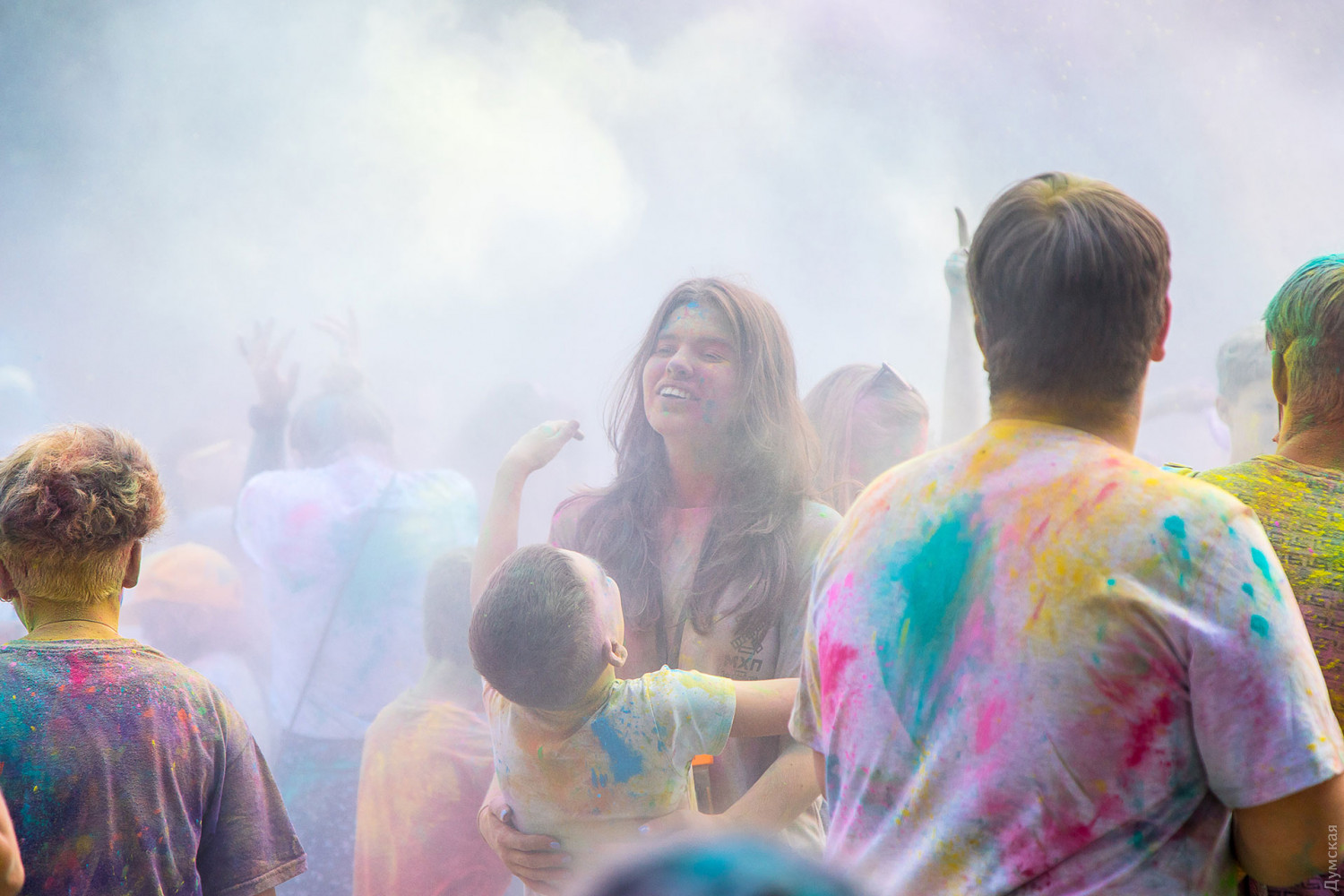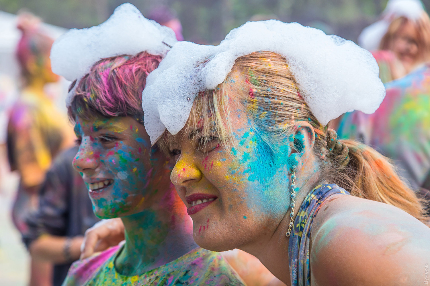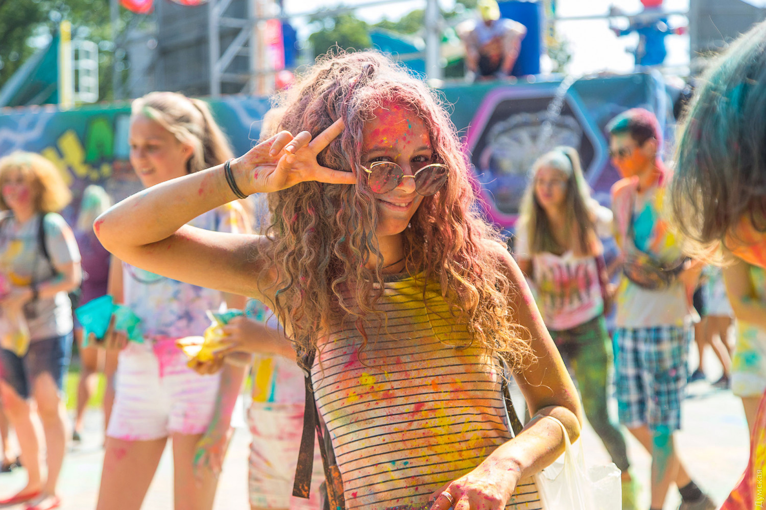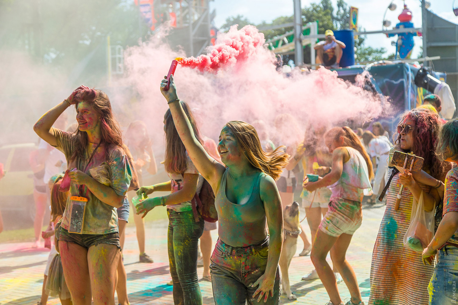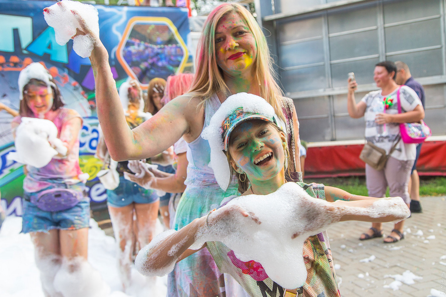 В самом начале мероприятия участников разделили на два условных лагеря, которые и схлестнулись по команде ведущего в красочном сражении. В конце мероприятия состоялась пенная вечеринка, а потом все желающие смогли смыть следы сражения и заодно охладиться. Для этого уже традиционно приехала машина одесских спасателей. Фото — Александр Гиманов