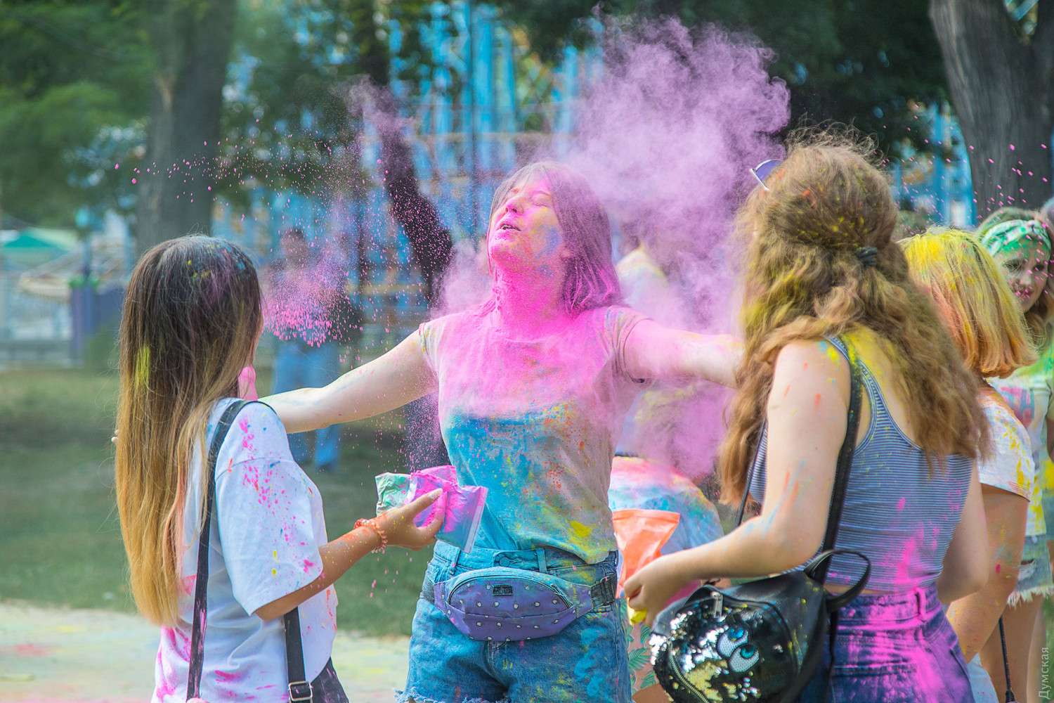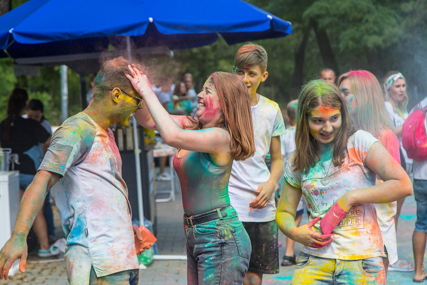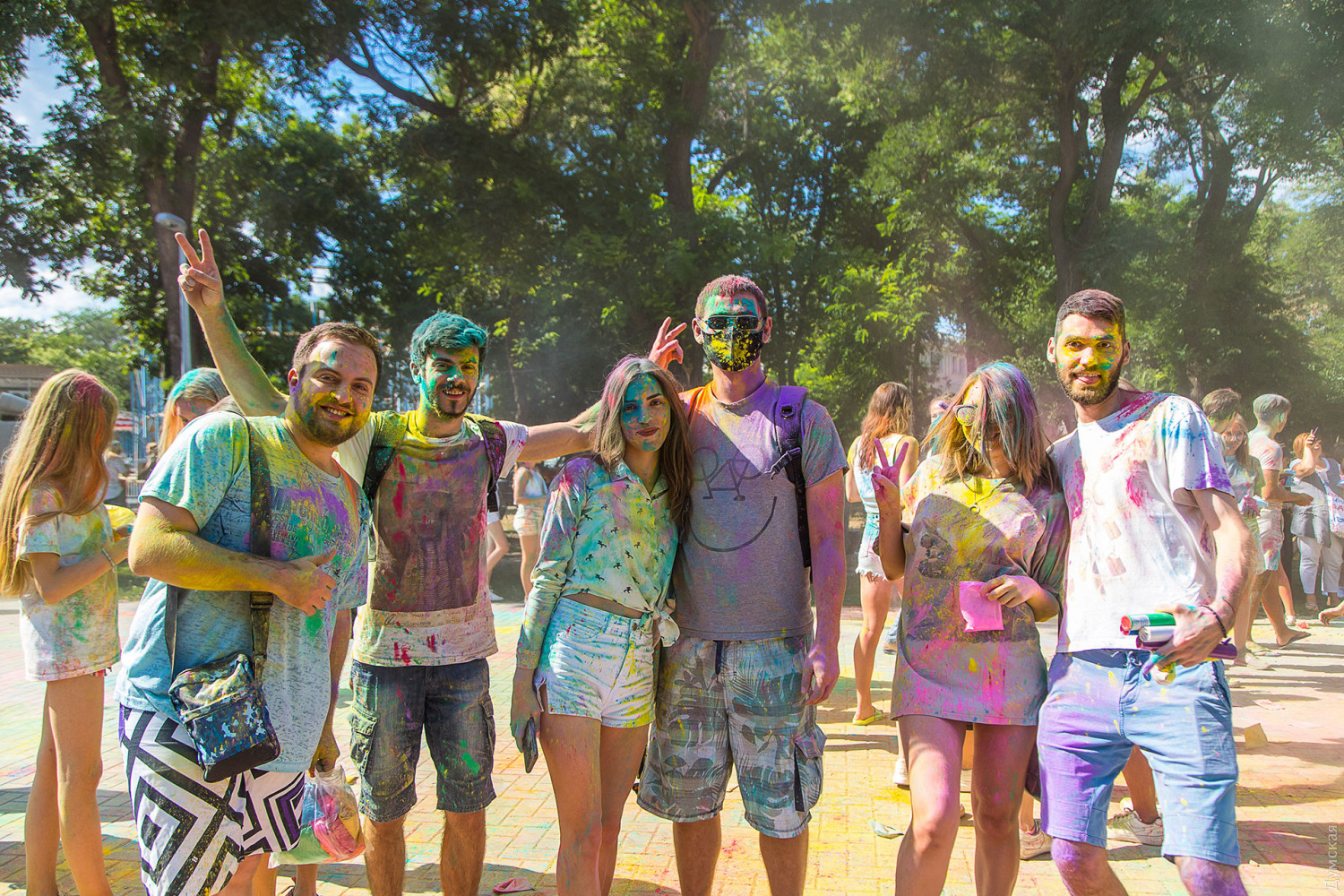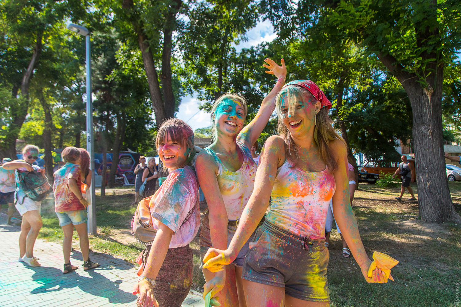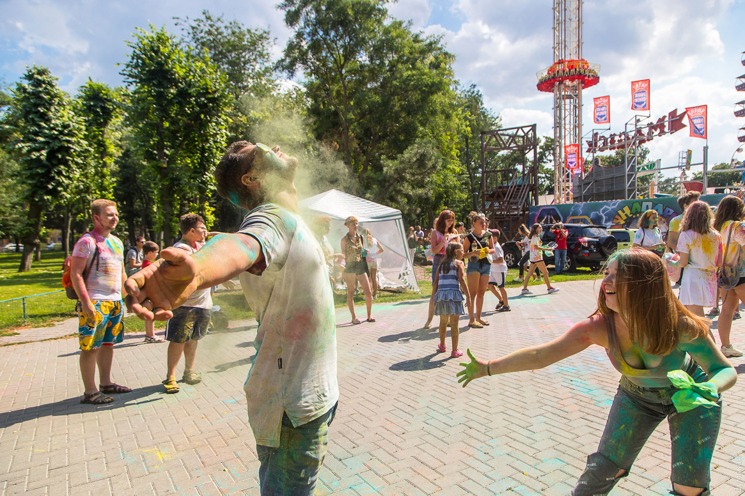 Четвертый одесский ColorFest прошел сегодня в парке Шевченко недалеко от Лунопарка. Участие в веселом и красочном мероприятии приняло около 200 человек. Молодые люди, заранее предупрежденные организаторами, приходили в белых вещах, которые не жалко было запачкать красками холи. Один пакетик цветного порошка стоил 50 гривен. При покупке нескольких действовала скидка.