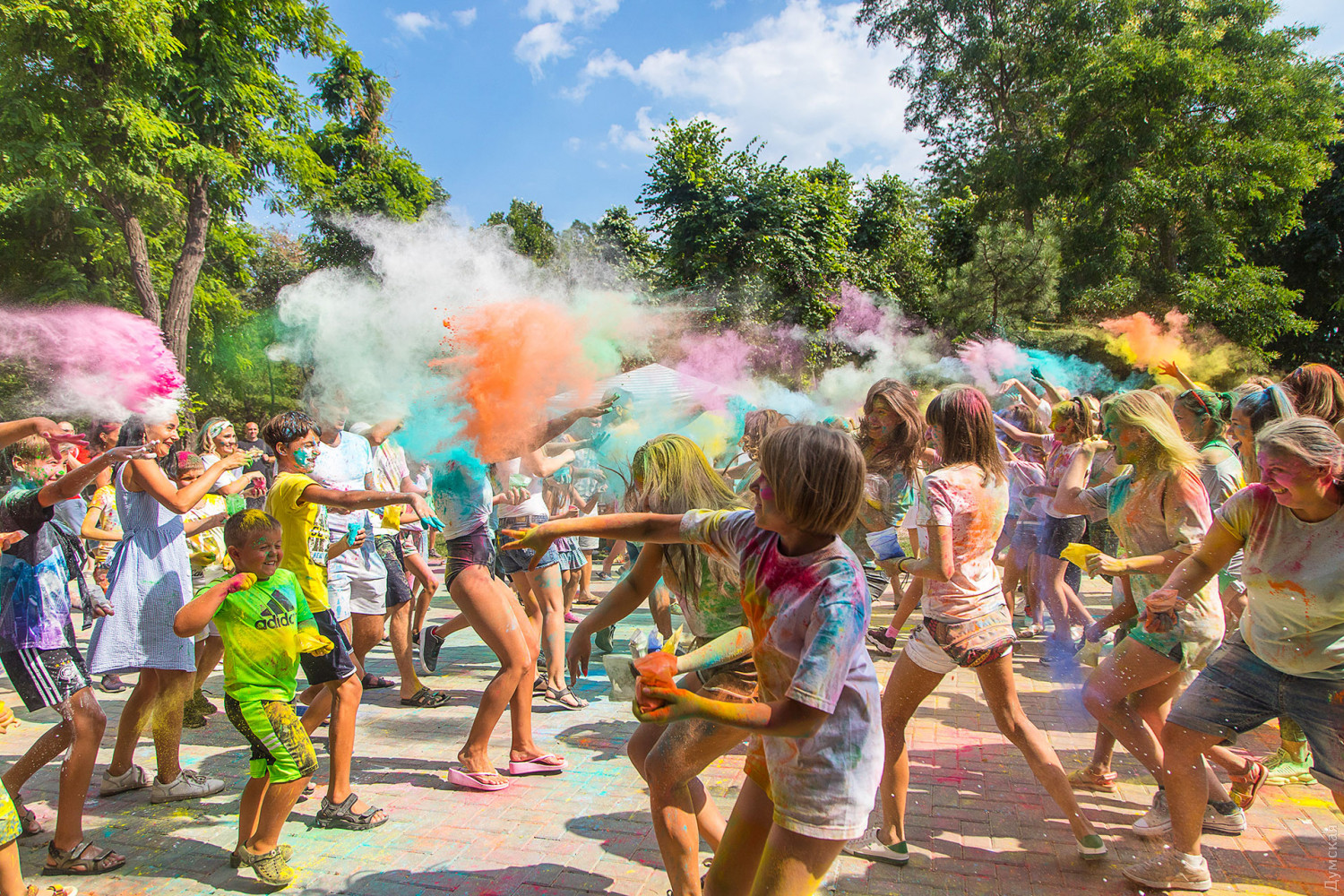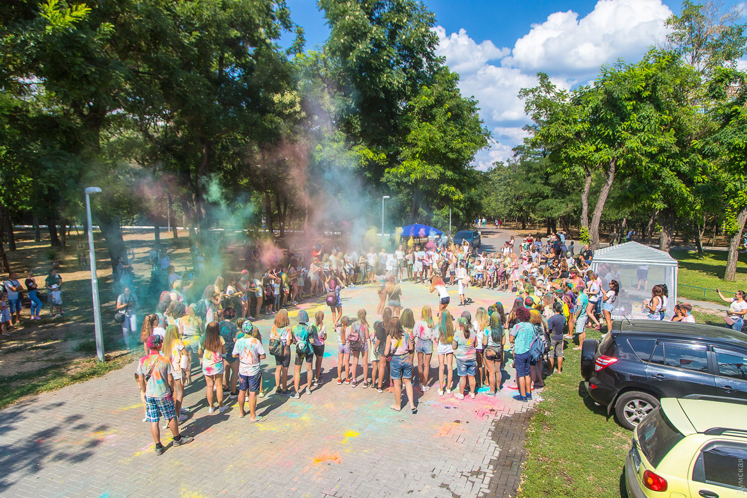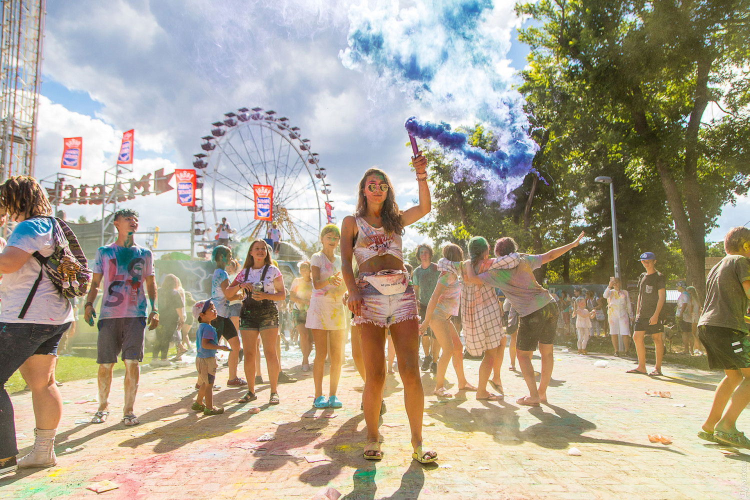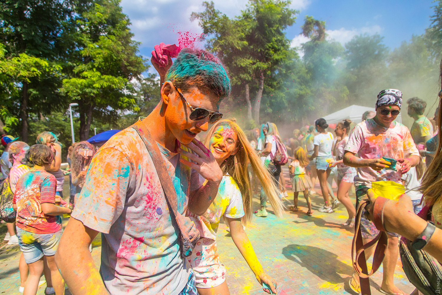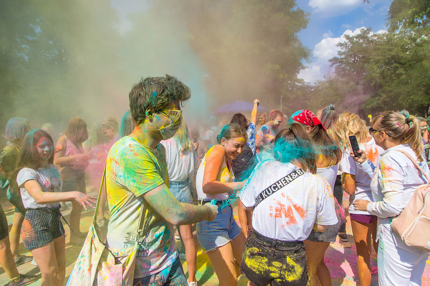 Четвертый одесский ColorFest прошел сегодня в парке Шевченко недалеко от Лунопарка. Участие в веселом и красочном мероприятии приняло около 200 человек. Молодые люди, заранее предупрежденные организаторами, приходили в белых вещах, которые не жалко было запачкать красками холи. Один пакетик цветного порошка стоил 50 гривен. При покупке нескольких действовала скидка.