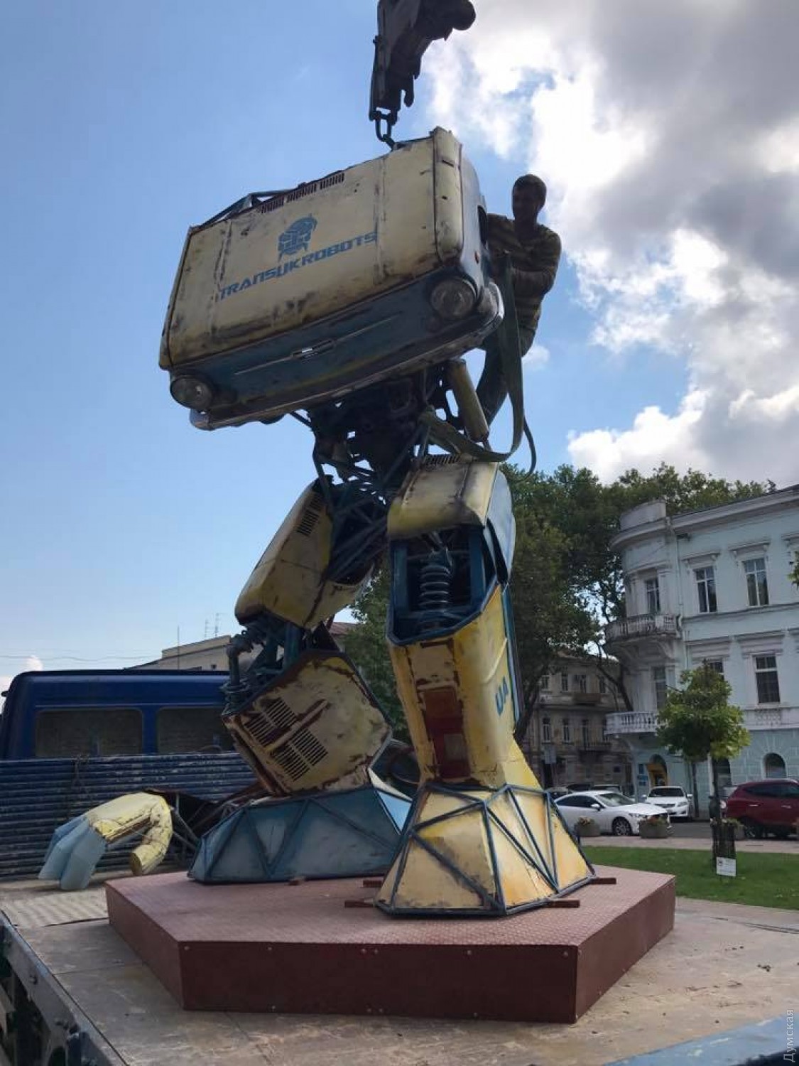 Робота, собранного из старого «Запорожца» одесским скульптором Александром Миловым, сегодня перевезли из Зеленого театра ко входу в музей Морского флота.