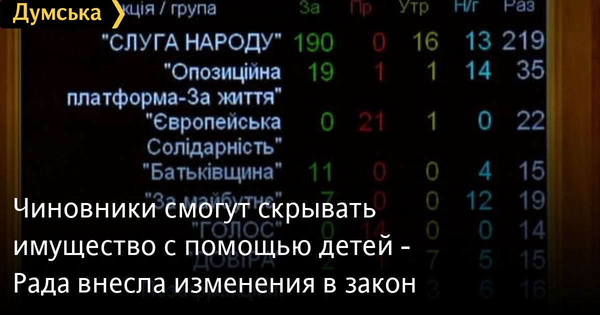 Чиновники смогут скрывать имущество с помощью детей — Рада внесла изменения в законВерховная Рада Украины приняла за основу проект закона № 3355-1, согласно которому из числа членов семьи субъекта декларирования исключили детей, которые не проживают с декларантами. За поддержку законопроекта проголосовали 244 депутата. Согласно законопроекту № 3355-1, чиновник может не декларировать имущество, если оно записано на несовершеннолетних детей, которые не проживают с декларантом. Отметим, ранее (с 18 октября 2019 года) вступили в силу изменения в закон «О предупреждении коррупции», которые расширили круг близких лиц и членов семьи субъектов декларирования. Теперь термин «близкие лица» в законе применяется к племяннику и племяннице, а также к отцу и матери жены (мужа) сына (дочери). Членами семьи субъекта декларирования также ранее считались его несовершеннолетние дети независимо от совместного проживания, связанности общим бытом и наличия взаимных прав и обязанностей. СМЕРТЬ РОССИЙСКИМ ОККУПАНТАМ! Заметили ошибку? Выделяйте слова с ошибкой и нажимайте control-enter |
