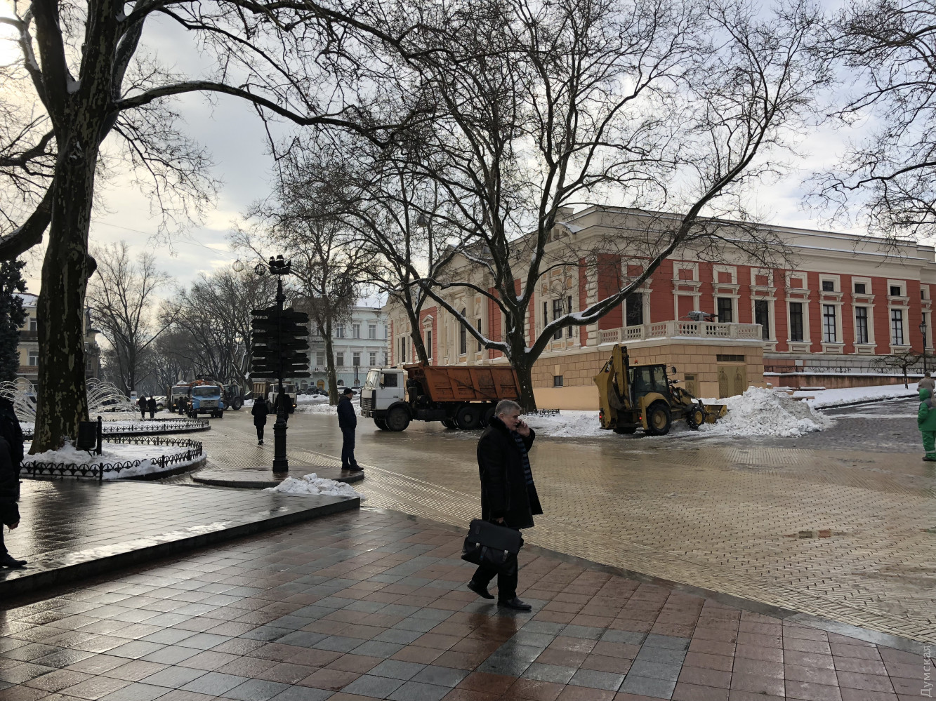 Сразу семь единиц техники участвуют в уборке снега на Думской площади Одессы, возле здания мэрии. Столько снегоуборочных машин в одном месте одесситы за два последних дня, пожалуй, и не видели.
