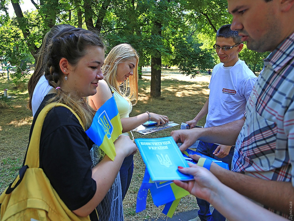Сегодня, 28 июня, в парке Шевченко каждый прохожий мог получить совершенно бесплатно основной закон нашего государства — Конституцию Украины. Такую акцию организовали активисты Одесской территориальной организации партии БПП «Солидарность» к 21-годовщине принятия Конституции. Как рассказали представители партии, согласно опросу фонда «Демократическая инициатива», который проводился у 2015 году, половина украинцев никогда не читали Конституцию. «Такую акцию мы проводим уже второй год подряд. Конституция – это основной закон, который закрепляет принципы функционирования государства, а также права и обязанности каждого гражданина. Поэтому очень важно, чтобы каждый знал о своих правах и умел отстаивать их в органах государственного и местного самоуправления, но и, конечно, не забывал об обязанностях перед государством», — говорит руководитель пресс-службы Одесской территориальной организации БПП «Солидарность» Юлия Чухало. Одесситы с радостью принимали книжечки и обещали читать их. В партии отметили, что к празднику также собрали и отправили подарки воинам в зону АТО. «Детские рисунки, письма-поздравления, флаги Украины, чай, кофе – все это отправилось нашим защитникам на фронт. Мы считаем, что в этот день также важно помнить о тех людях, которые сейчас защищают территориальную целостность и независимость нашей страны, и благодаря которым у нас сегодня мир», — уточняют в пресс-службе партии. Руководитель секретариата БПП «Солидарность» в Одесской области Валентина Шульц добавила: «Мы дарим каждому прохожему евроленту и брошюру основного закона. Такие акции проходят по всей Украине. Наша цель — информирование украинцев о правах и обязанностях. Хотелось бы, чтобы молодые люди были более подкованы юридически и политически грамотны». СМЕРТЬ РОСІЙСЬКИМ ОКУПАНТАМ! Помітили помилку? Виділяйте слова з помилкою та натискайте control-enter |