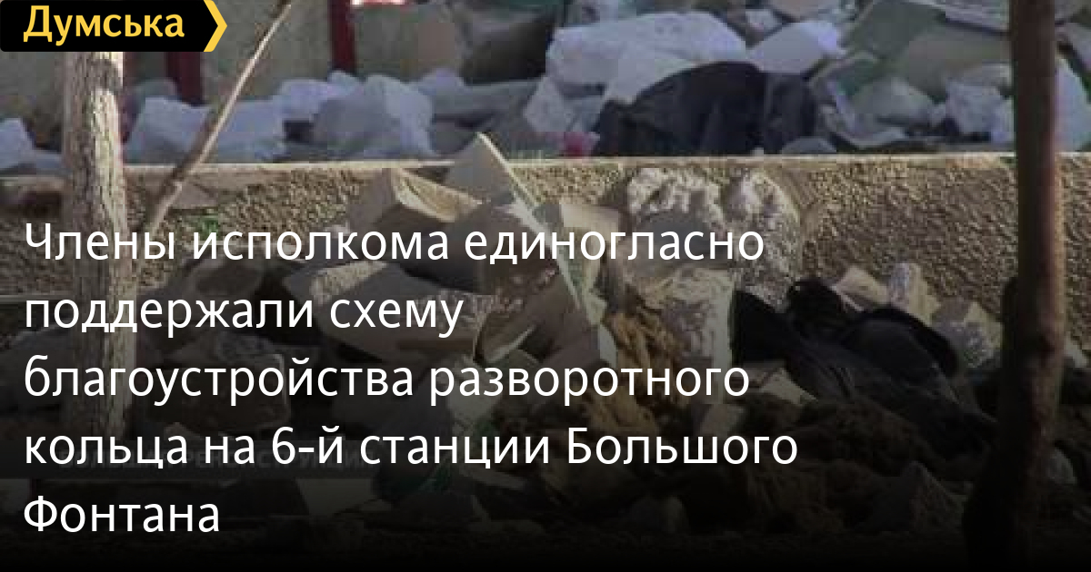 Члены исполкома единогласно поддержали схему благоустройства разворотного кольца на 6-й станции Большого ФонтанаСтихийная торговля вне закона. Исполком городского совета утвердил схему благоустройства трамвайного кольца на шестой станции Большого Фонтана, где проводится демонтаж павильонов мини-рынка «У Люси». Кроме того, будет продолжена ликвидация незаконных торговых точек на Старосенной площади. СМЕРТЬ РОССИЙСКИМ ОККУПАНТАМ! Заметили ошибку? Выделяйте слова с ошибкой и нажимайте control-enter Думская ТВ. Сюжеты: