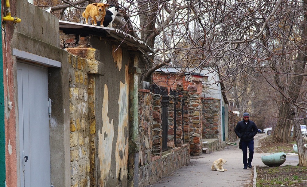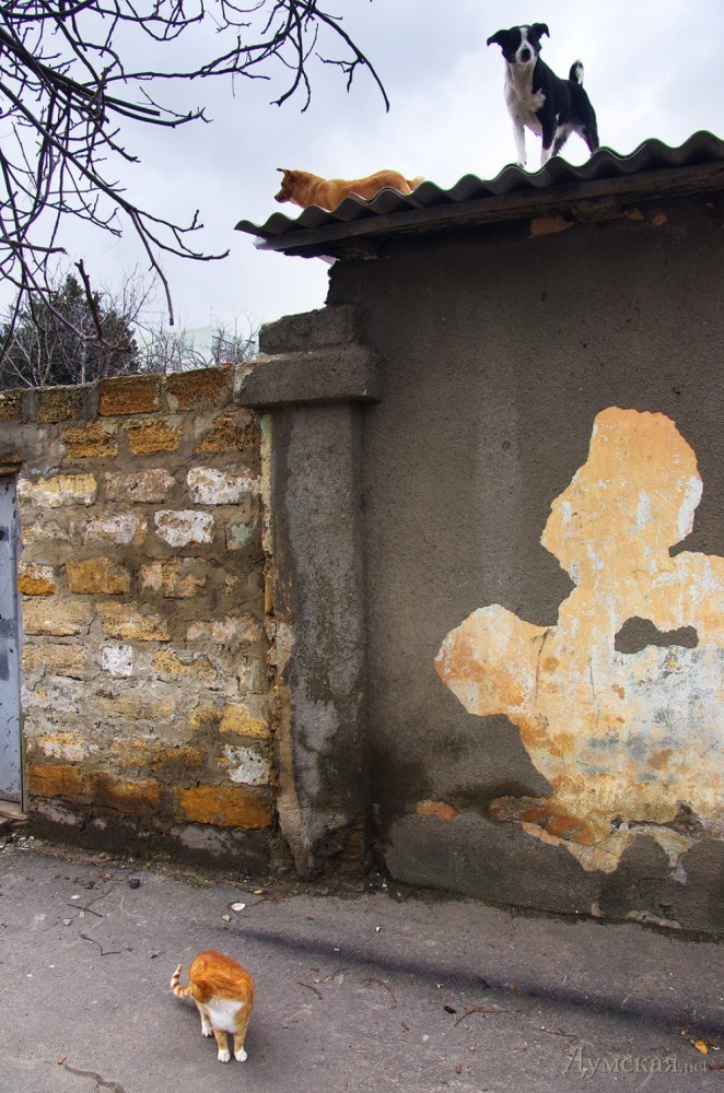 Ну, начнём с того, что это не Аркадия. Это ул. Тенистая, а забор (вот чья крыша не уверен) принадлежит туристам Одессы. Раньше это было общество «Туристские тропы». А собаки мне знакомы: они меня постоянно облаивают или приветствуют.