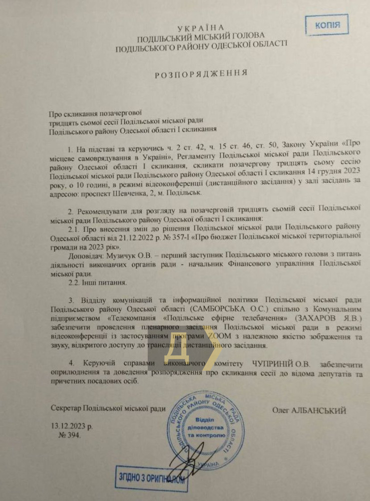 Щоб без зайвих запитань: у Подільську вирішили провести сесію міськради у зуміПозачергову сесію Подільської міської ради планують провести 14 грудня по відеоконференції. Як випливає з розпорядження секретаря міськради, депутати зберуться, щоб внести правки до бюджету на поточний рік. Мабуть, щоб не відповідати на незручні запитання про те, на що підуть гроші, міська влада вирішила зібрати народних обранців у зумі. Нагадаємо, що в Подільську діє перша відкрита коаліція депутатів колишньої ОПЗЖ і «слуг народу». Помітили помилку? Виділяйте слова з помилкою та натискайте control-enter |