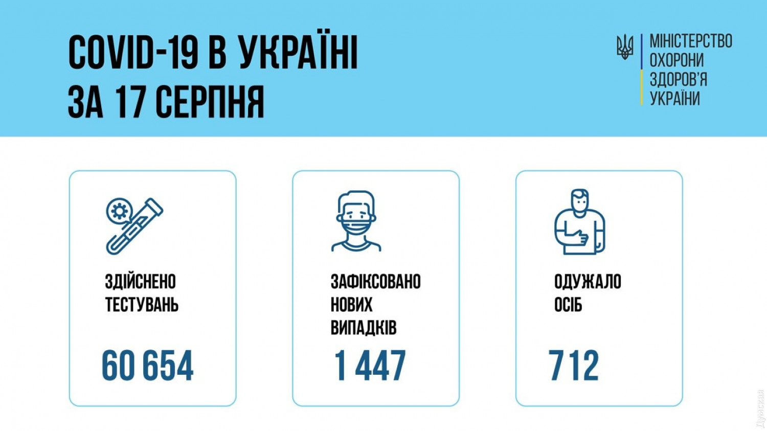 1447 новых случаев заражения COVID-19 лабораторно подтвердили в Украине 17 августа. По данным Центра общественного здоровья, 40 пациентов вчера скончались от осложнений. Среди новых заболевших — 104 ребенка и 38 медработников. Наибольшее количество новых случаев выявлено в Киеве (181), Донецкой (155), Одесской (130), Днепропетровской (93) и Харьковской (89) областях. В медучреждения страны вчера госпитализировали 677 человек. Выздоровели 712 человек. Всего за период пандемии болезнь побороли 2 198 220 человек. Проведено 60 654 тестирования. СМЕРТЬ РОСІЙСЬКИМ ОКУПАНТАМ! Помітили помилку? Виділяйте слова з помилкою та натискайте control-enter |