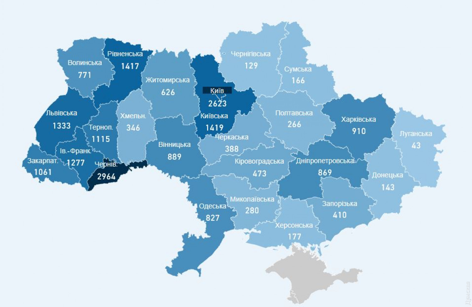 По состоянию на 9:00 24 мая в Украине 20986 лабораторно подтвержденных случаев COVID-19, из них 617 летальных, 7108 пациентов выздоровели. За сутки зафиксировано 406 новых случаев и 12 смертельных исходов. Заражение по областям: Винницкая область — 889 случаев; Волынская область — 771 случай; Днепропетровская область — 869 случаев; Донецкая область — 143 случая; Житомирская область — 626 случаев; Закарпатская область — 1061 случай; Запорожская область — 410 случаев; Ивано-Франковская область — 1277 случаев; Кировоградская область — 473 случая; Киев — 2623 случая; Киевская область — 1419 случаев; Львовская область — 1333 случая; Луганская область — 43 случая; Николаевская область — 280 случаев; Одесская область — 827 случаев; Полтавская область — 266 случаев; Ровенская область — 1417 случаев; Сумская область — 166 случаев; Тернопольская область — 1115 случаев; Харьковская область — 910 случаев; Херсонская область — 177 случаев; Хмельницкая область — 346 случаев; Черновицкая область — 3028 случаев; Черкасская область — 388 случаев; Черниговская область — 129 случаев. По состоянию на утро 24 мая 2020 в Центр поступило 848 сообщений о подозрении на COVID-19. Всего с начала 2020 года поступило 52534 сообщения о подозрении на COVID-19. СМЕРТЬ РОСІЙСЬКИМ ОКУПАНТАМ! Помітили помилку? Виділяйте слова з помилкою та натискайте control-enter Новини по цій темі: 4 березня 2023: "Вакцини-довгожителі", або Як щеплення проти COVID-19 перетворилися в Україні на небезпечний ритуал 27 січня 2023: МОЗ зобов`язали опублікувати договори на закупівлю вакцин проти COVID-19: апеляційний суд задовольнив позов журналіста "Думської" 11 січня 2023: За тиждень в Одесі зафіксовано 159 випадків ковіду 4 січня 2023: За тиждень в Одесі зареєстровано 113 випадків ковіду |