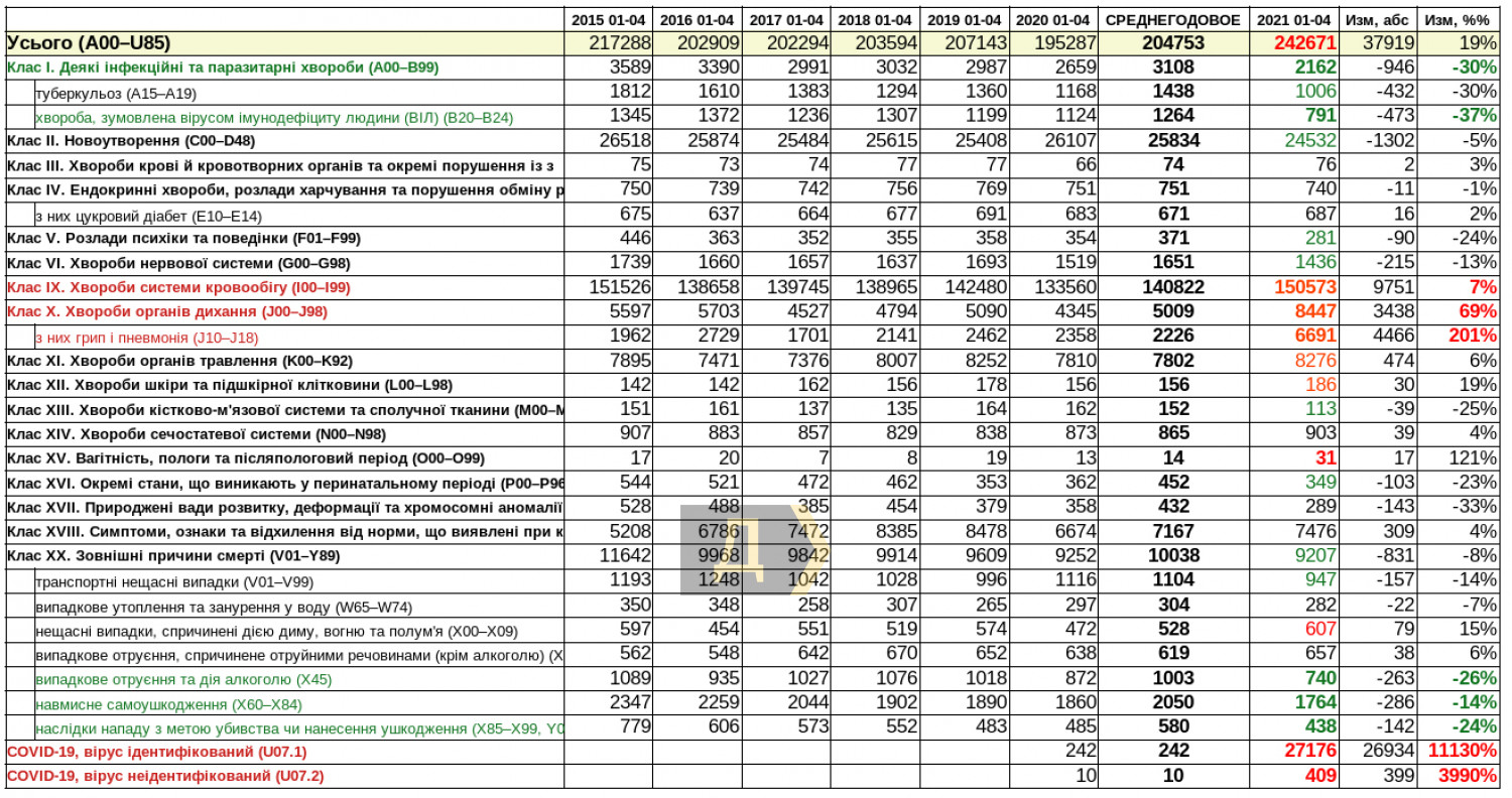COVID-19 вошел в тройку основных причин смерти в Украине: опубликована статистикаГосударственная служба статистики опубликовала отчет о смертности в Украине за период с 1 января по 30 апреля 2021 года. По данным статистического ведомства, коронавирусная инфекция унесла за этот период жизни 27 585 украинцев. Это выше, чем объявляли раньше по оперативным данным Минздрава и CНБОУ: за первые четыре месяца там зафиксировали 25 856 смертей. Общее число умерших за четыре месяца составило 242671 человек. Чтобы оценить эту информацию, мы подготовили сводную таблицу с данными о причинах смерти за периоды с января по апрель, начиная с 2015 года. Как видите, в этом году COVID-19 стал второй по значимости причиной смерти украинцев, отодвинув на третье место онкологические заболевания. Печальное лидерство по-прежнему удерживают кардиологические проблемы: за первые четыре месяца этого года болезни сердца и сердечно-сосудистой системы унесли жизни более 150 тысяч украинцев. В целом избыточная смертность (по сравнению со среднегодовыми значениями) составила почти 38 тысяч. Нетрудно заметить, что прирост произошел за счет трех основных статей: COVID-19 (+27,3 тысячи), болезни сердца и сосудов (+9,8 тысячи) и болезни органов дыхания, в первую очередь грипп и различные виды пневмонии (+4,5 тысячи). Если стократное увеличение числа умерших от коронавируса объясняется пандемией, то рост смертей по другим причинам нуждается в пояснениях. Например, количество смертей от гриппа и пневмоний, которое во все годы было относительно стабильным, сейчас выросло втрое — при том, что смерти от пневмоний, вызванных COVID-19, учтены отдельно. Такую аномалию можно объяснить, например, улучшением диагностики: сейчас при любом подозрении врачи первым делом направляют пациентов на КТ легких. С другой стороны, рост может быть следствием недостаточного выявления смертей от COVID-19 (то есть пневмонии коронавирусной этиологии попадают в статистику «обычных»), и в таком случае реальное число жертв пандемии окажется выше. Есть еще одна гипотеза — резкий рост болезней органов дыхания может быть вызван неправильным использованием медицинских масок. Что касается смертности от сердечно-сосудистых болезней, по этому показателю мы сейчас откатились на шесть лет назад. Заметное увеличение числа таких смертей может быть связано с коронавирусной инфекцией — этого мнения придерживается, в частности, врач-инфекционист профессор Ольга Голубовская, которая считает обострение сердечно-сосудистых патологий отдаленным последствием COVID-19. В то же время ряд специалистов предполагает, что рост может быть вызван ухудшением доступности медицинской помощи из-за всеобщего карантина и перепрофилирования учреждений кардиологического профиля на лечение инфекционных больных. Аналогично, закрытие на карантин женских консультаций по всей стране могло стать причиной существенного увеличения числа смертей беременных женщин и рожениц. Да, такие случаи единичны (в среднем 14 за прошлые годы и 31 - в январе-апреле 2021-го), однако каждая такая трагедия требует изучения и выяснения причин. Также стоит обратить внимание на классы заболеваний, по которым зафиксировано значительное снижение смертности. Резко, более чем в полтора раза, упала смертность от ВИЧ/СПИД, также снизилась количество умерших от онкологических болезней. Это 