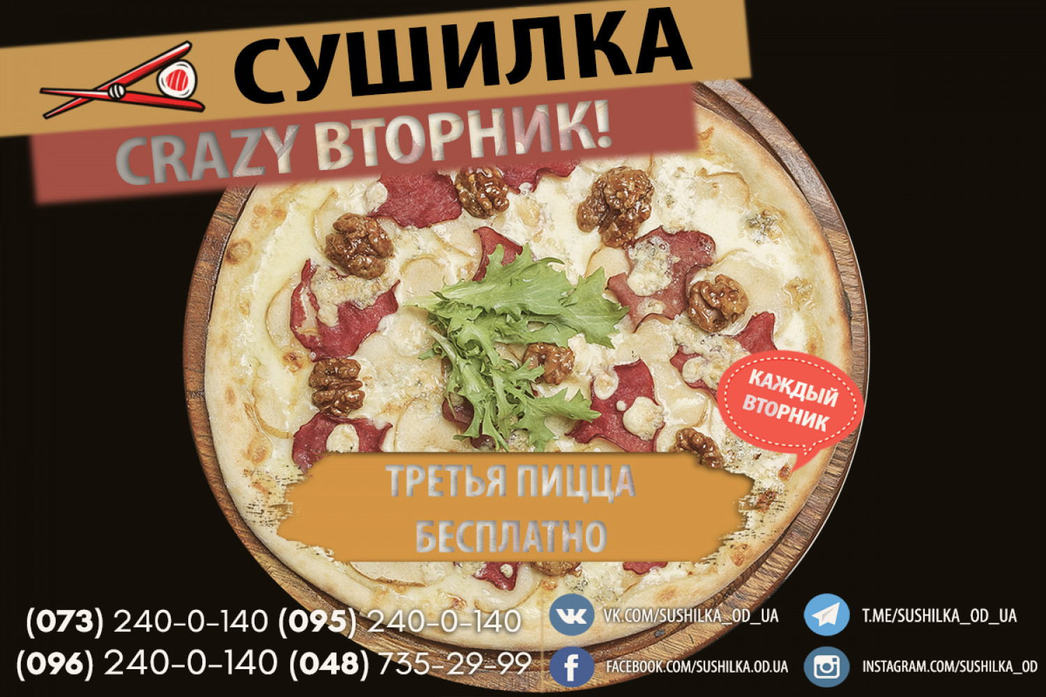 Crazy вторники: «Сушилка» предлагает три пиццы по цене двух (на правах рекламы)Со следующей недели служба доставки еды «Сушилка» вводит новую постоянную акцию «Crazy вторник». Так, каждый вторник при заказе двух пицц третью клиент получает в подарок! Таким образом, при заказе, к примеру, двух пицц «Диабло» и «4 мяса» вы можете получить «4 сыра» совершенно бесплатно. При этом в случае если вы заказываете одну пиццу, то на вторую получаете 50% скидку. Акция распространяется на пиццы всех доступных размеров. Также обращаем ваше внимание на то, что скидка будет применяться на пиццу с меньшей стоимостью. Напомним, чуть больше недели назад «Сушилка» расширила меню, добавив множество роллов, ввела новые запеченные роллы, гунканы, пиццы и салаты. Заказ можно сделать на сайте sushilka.od.ua или по телефонам: 073-240-0-140; 095-240-0-140; 096-240-0-140; 048-735-29-99. СМЕРТЬ РОССИЙСКИМ ОККУПАНТАМ! Заметили ошибку? Выделяйте слова с ошибкой и нажимайте control-enter |