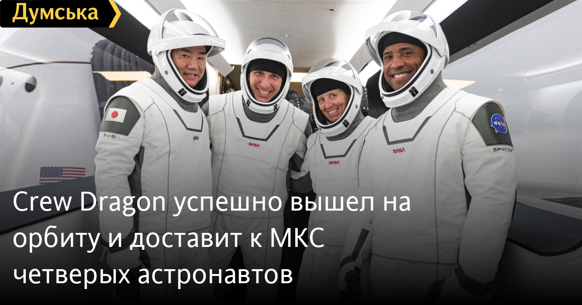 Компания SpaceX Илона Маска запустила корабль Crew Dragon с четырьмя астронавтами на борту. Это первая операционная миссия Crew Dragon для NASA. Ракета-носитель Falcon 9 стартовала с мыса Канаверал во Флориде, пишет РБК. Корабль Crew Dragon доставит на МКС четырех американских и одного японского астронавта. Онлайн-трансляцию запуска вели на YouTube каналах NASA и SpaceX. После запуска NASA сообщило, что первая ступень успешно отделилась и приземлилась на плавучую платформу в Атлантическом океане. Также успешно отделилась вторая ступень. Позже Crew Dragon успешно вышел на орбиту. Участниками первой операционной миссии Сrew Dragon стали астронавты NASA Майкл Хопкинс, Виктор Гловер, Шеннон Уокер, а также авиаинженер японского аэрокосмического агентства JAXA Соити Ногути.