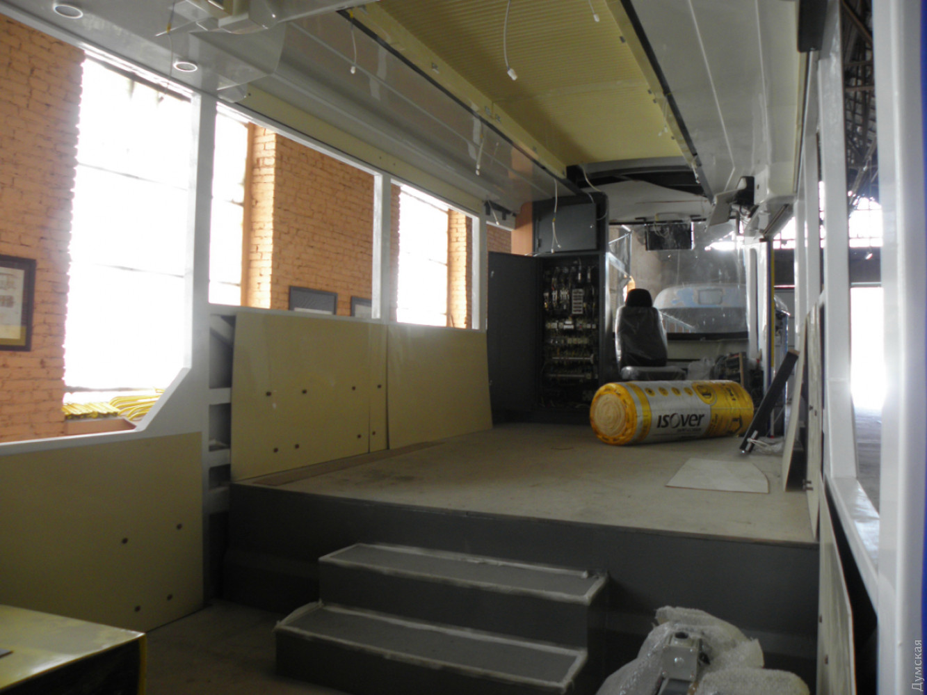 «Это что-то вроде эксперимента, — рассказывает Иван Цюро. – Мы его задумали, когда была проблема с кольцом в Аркадии, и нужны были «тяни-толкаи», трамваи, способные ездить вперед и назад. В одной из таких «Татр» мы сделали выходы на обе стороны. Потом вопрос с кольцом решился, а вагон остался. Но мы его доделаем, пригодится».