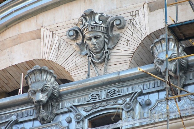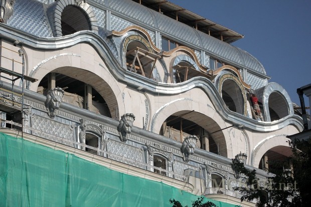 Строители уже сняли леса с верхней части фасадов здания: некоторые элементы украшений и лепки будущей гостиницы стали доступны для взора.